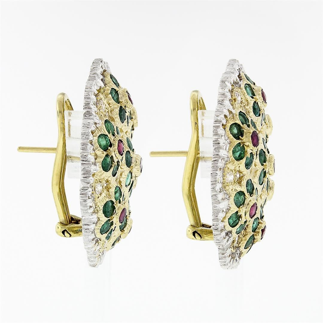 An estate solid 19k yellow & white gold button earrings, with 36 round brilliant cut natural diamonds (E/F- VVS2/VS1; 0.87ctw,) and 84 round cut natural emeralds (5.04ctw ), and 14 round brilliant cut natural rubies (1.03ctw ).The earrings measure approximately 29mm in diameter and weigh a total of 21.31 grams.