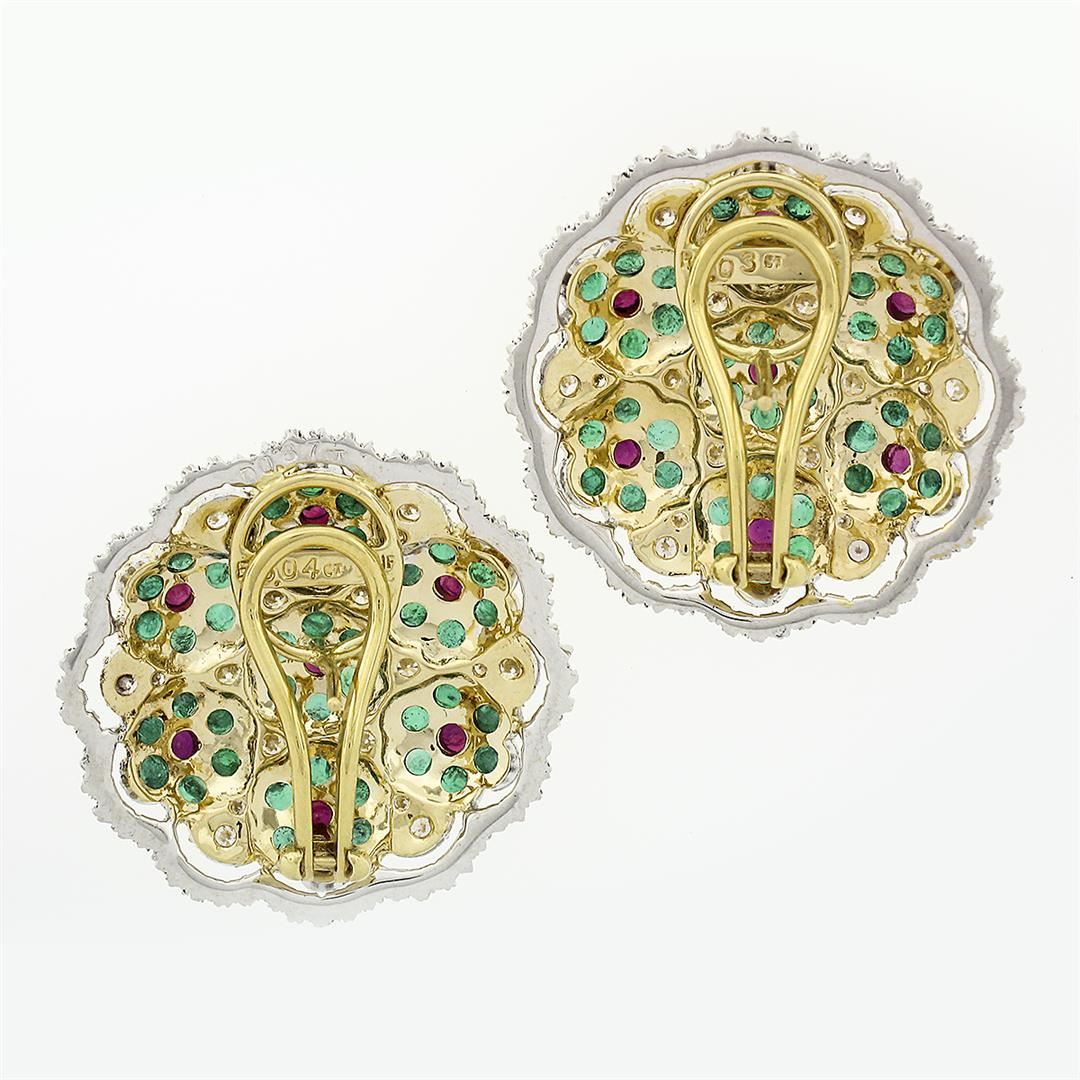 An estate solid 19k yellow & white gold button earrings, with 36 round brilliant cut natural diamonds (E/F- VVS2/VS1; 0.87ctw,) and 84 round cut natural emeralds (5.04ctw ), and 14 round brilliant cut natural rubies (1.03ctw ).The earrings measure approximately 29mm in diameter and weigh a total of 21.31 grams.
