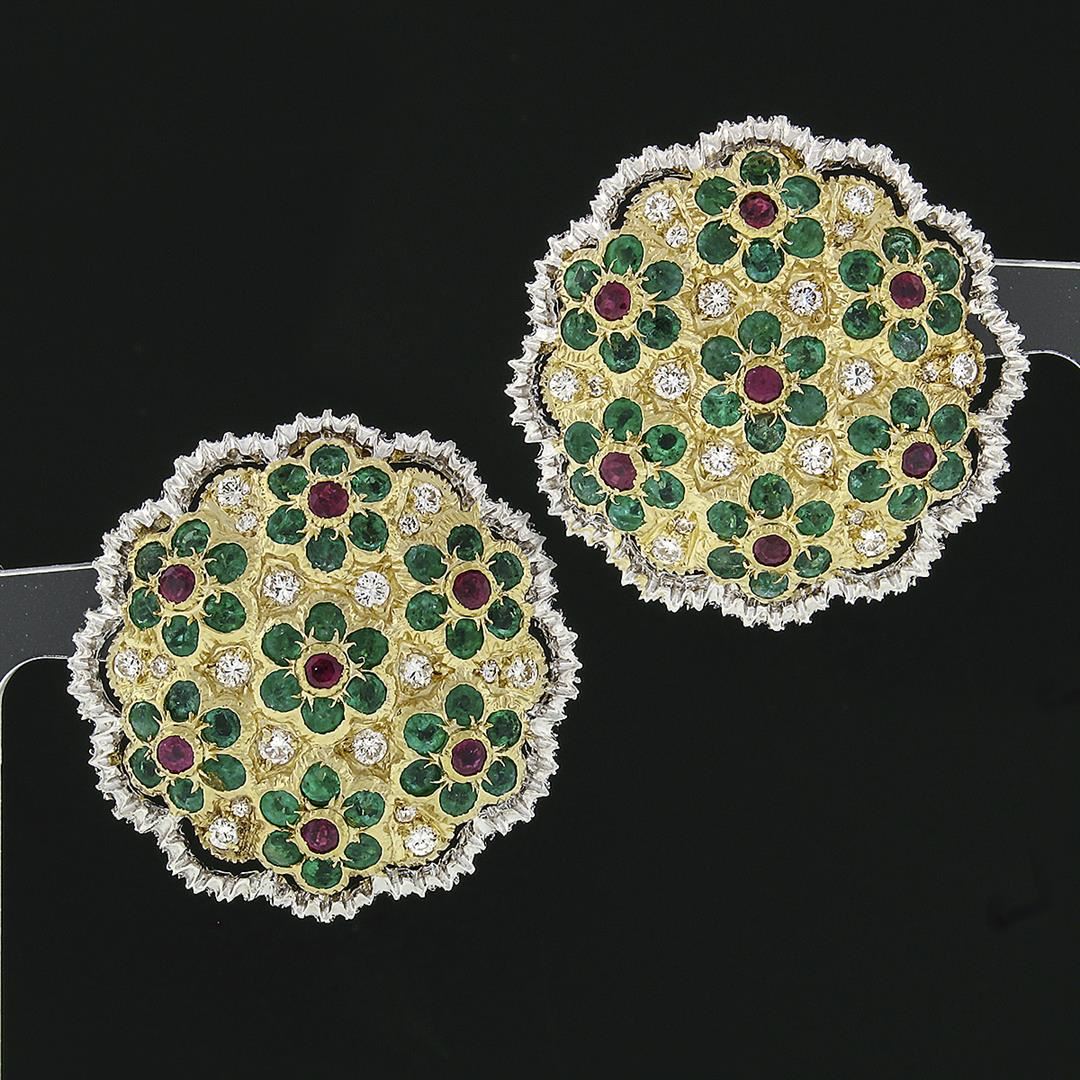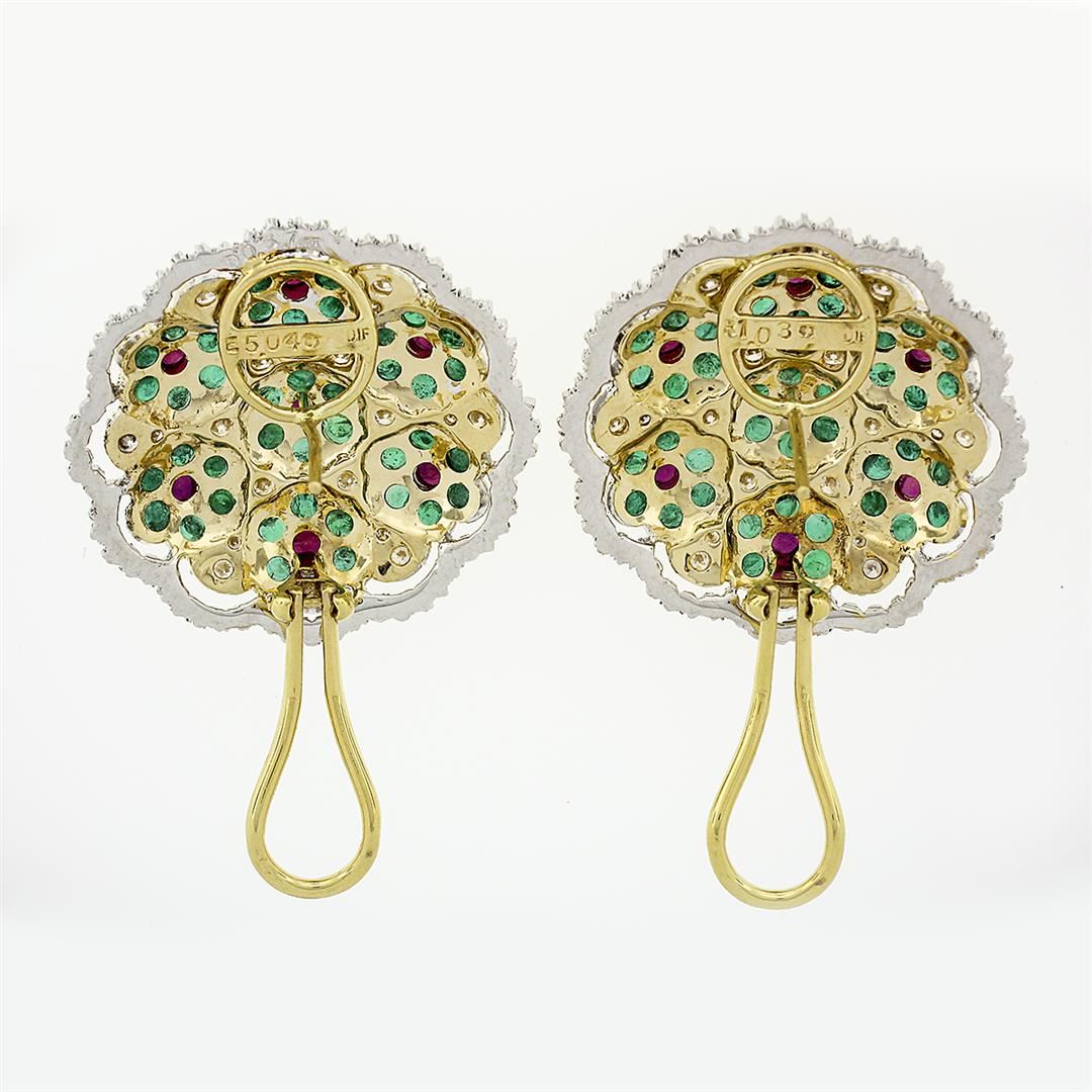 An estate solid 19k yellow & white gold button earrings, with 36 round brilliant cut natural diamonds (E/F- VVS2/VS1; 0.87ctw,) and 84 round cut natural emeralds (5.04ctw ), and 14 round brilliant cut natural rubies (1.03ctw ).The earrings measure approximately 29mm in diameter and weigh a total of 21.31 grams.