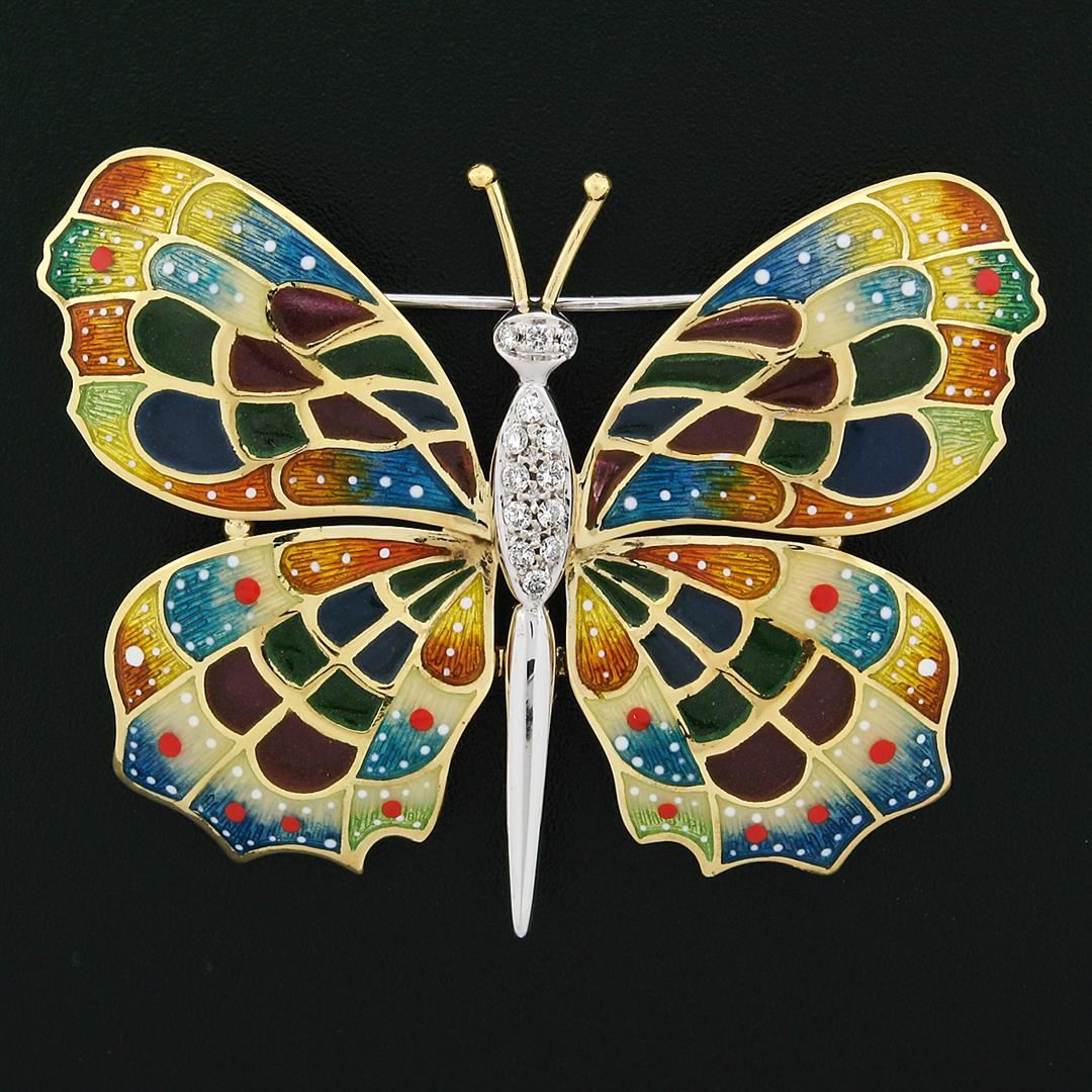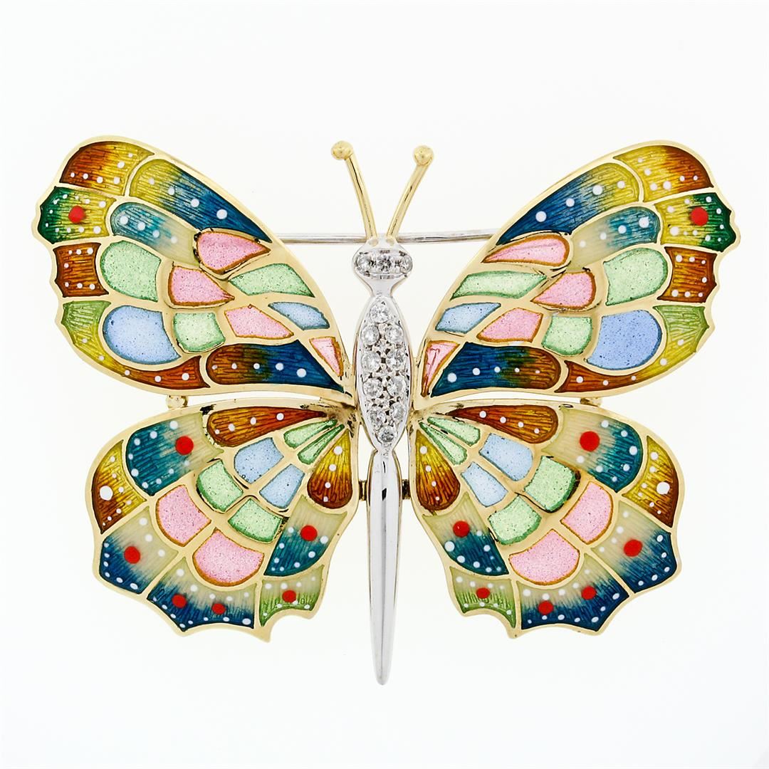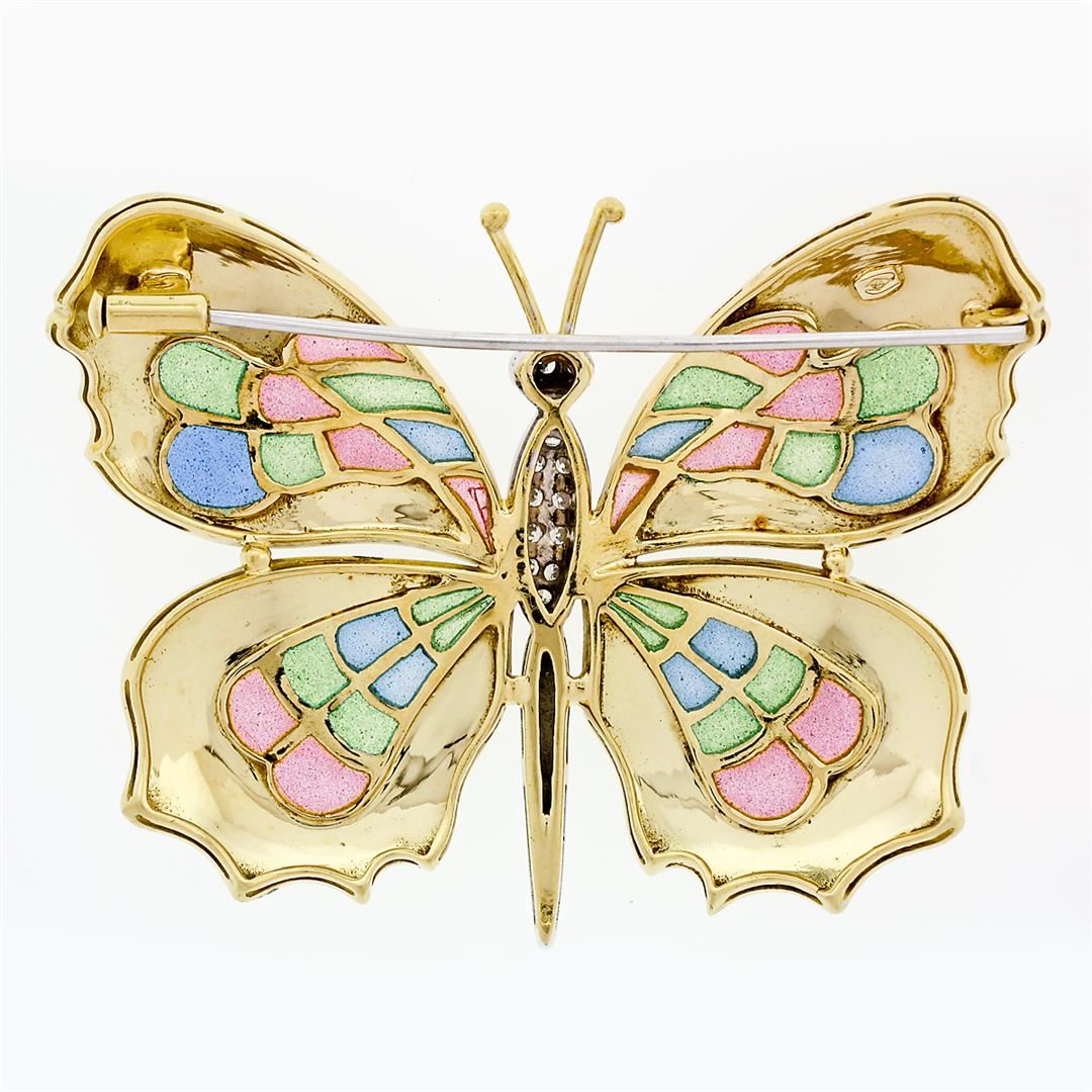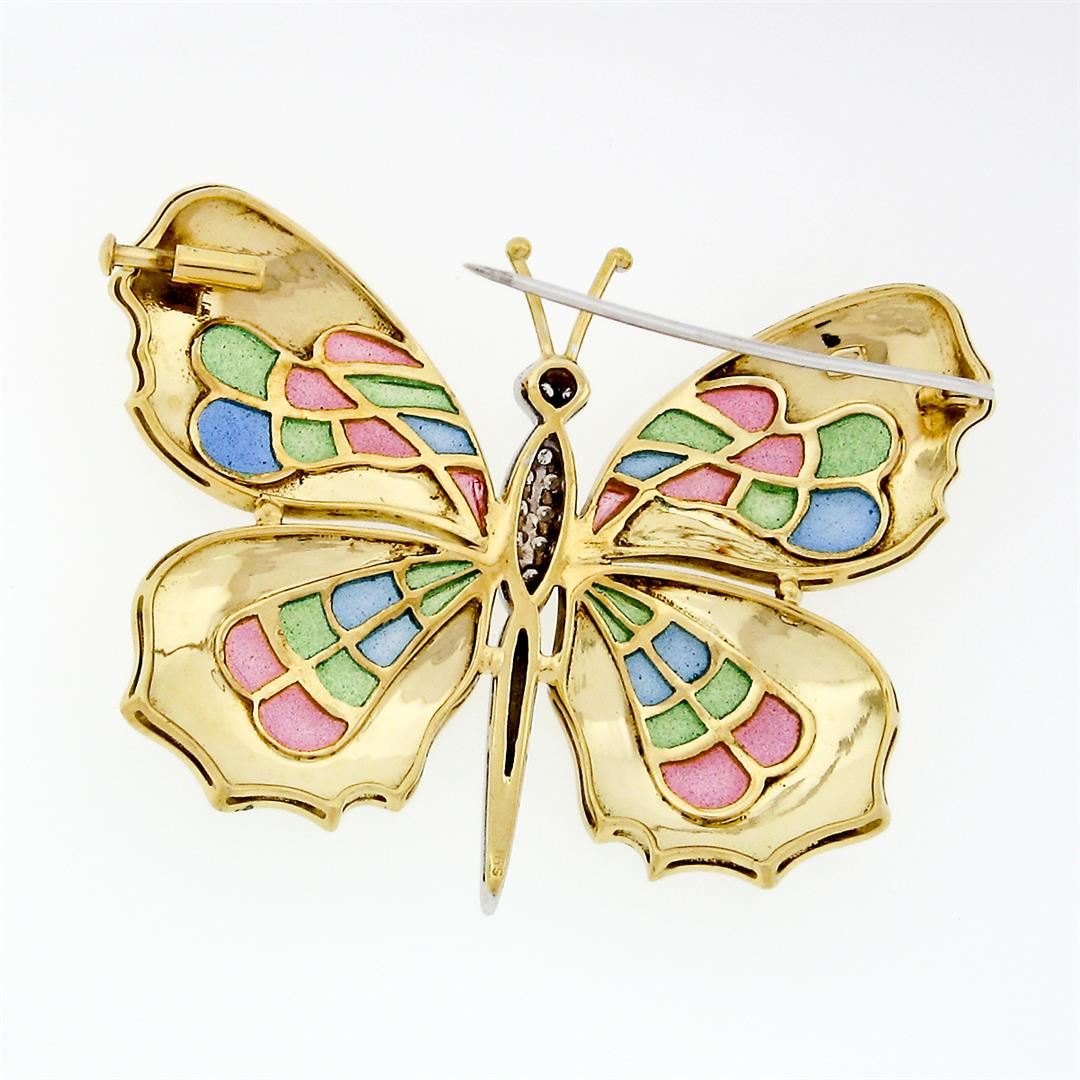 An estate solid 18k yellow gold butterfly pin brooch, with enamel work & 13 round brilliant cut natural diamonds (F/G- VS1/VS2; 0.26ctw). Measures 43x56mm and weighs a total of 19.38 grams.