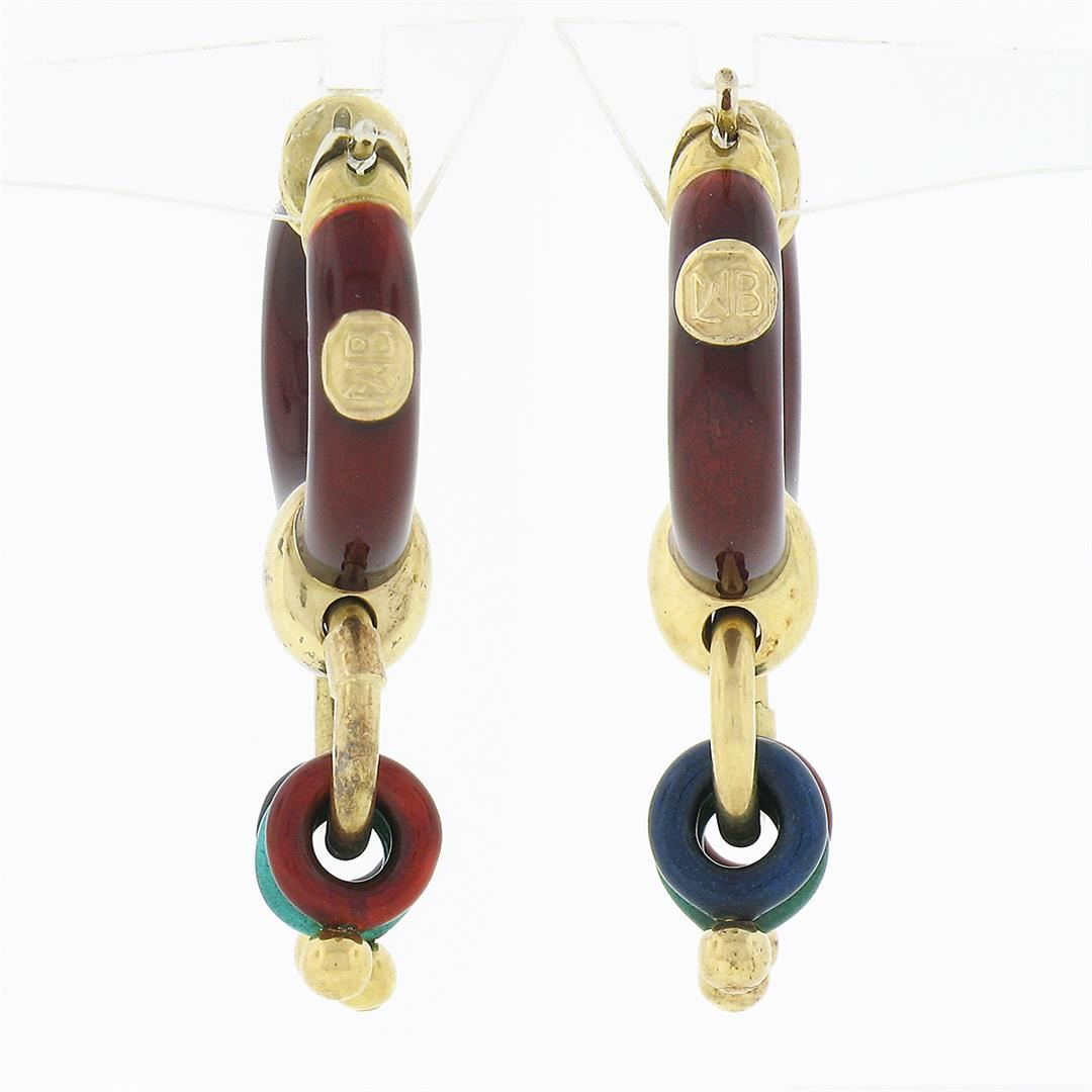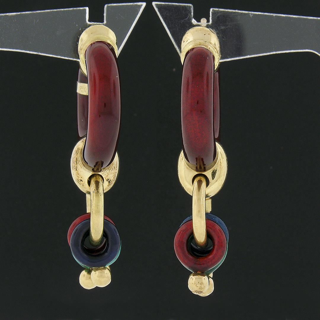 A solid 18k yellow gold drop dangle earrings, with enamel work. The earrings measure approximately 39.45x7.50mm and weigh a total of 13.21 grams.