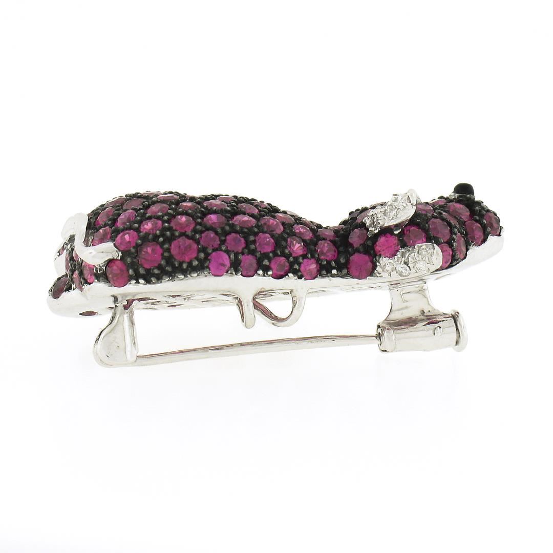 A solid 18k white gold hippo brooch pendant, with numerous of round brilliant cut natural rubies (4.0ctw), 9 round brilliant cut natural diamonds (G/H - VS2-SI2 ; 0.09ctw), and 1 round cabochon cut natrual black onyx (1.5mm). Measures 19.5x31.6mm and weighs a total of 8.52 grams.