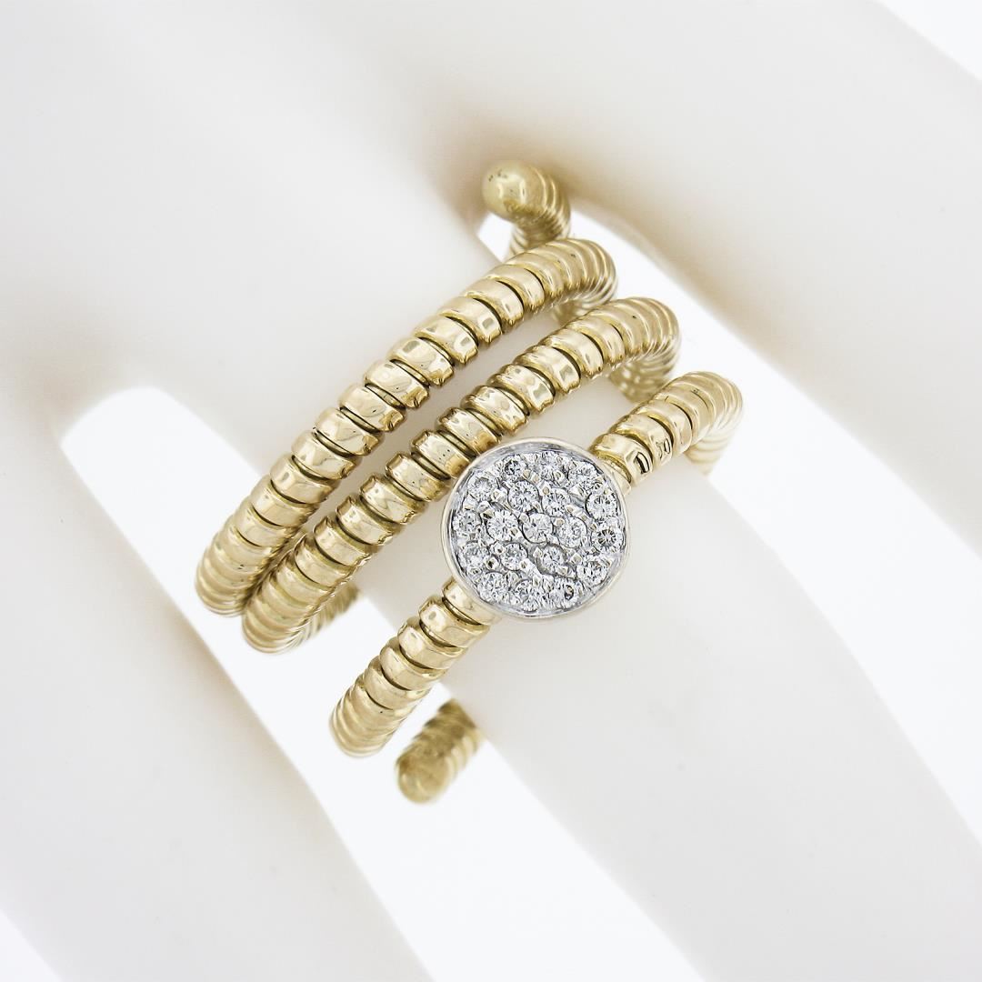 A solid 18k yellow & white gold stack look ring, with 19 round cut natural diamonds (H/I - SI1/SI2 ; 0.20ctw). The ring is size 6.5, weighs a total of 10.84 grams, and measures 16.2mm wide.