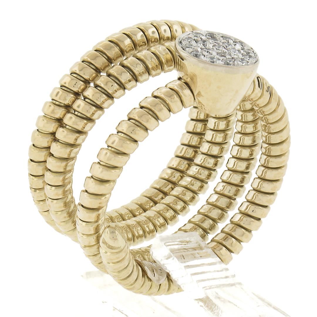 A solid 18k yellow & white gold stack look ring, with 19 round cut natural diamonds (H/I - SI1/SI2 ; 0.20ctw). The ring is size 6.5, weighs a total of 10.84 grams, and measures 16.2mm wide.