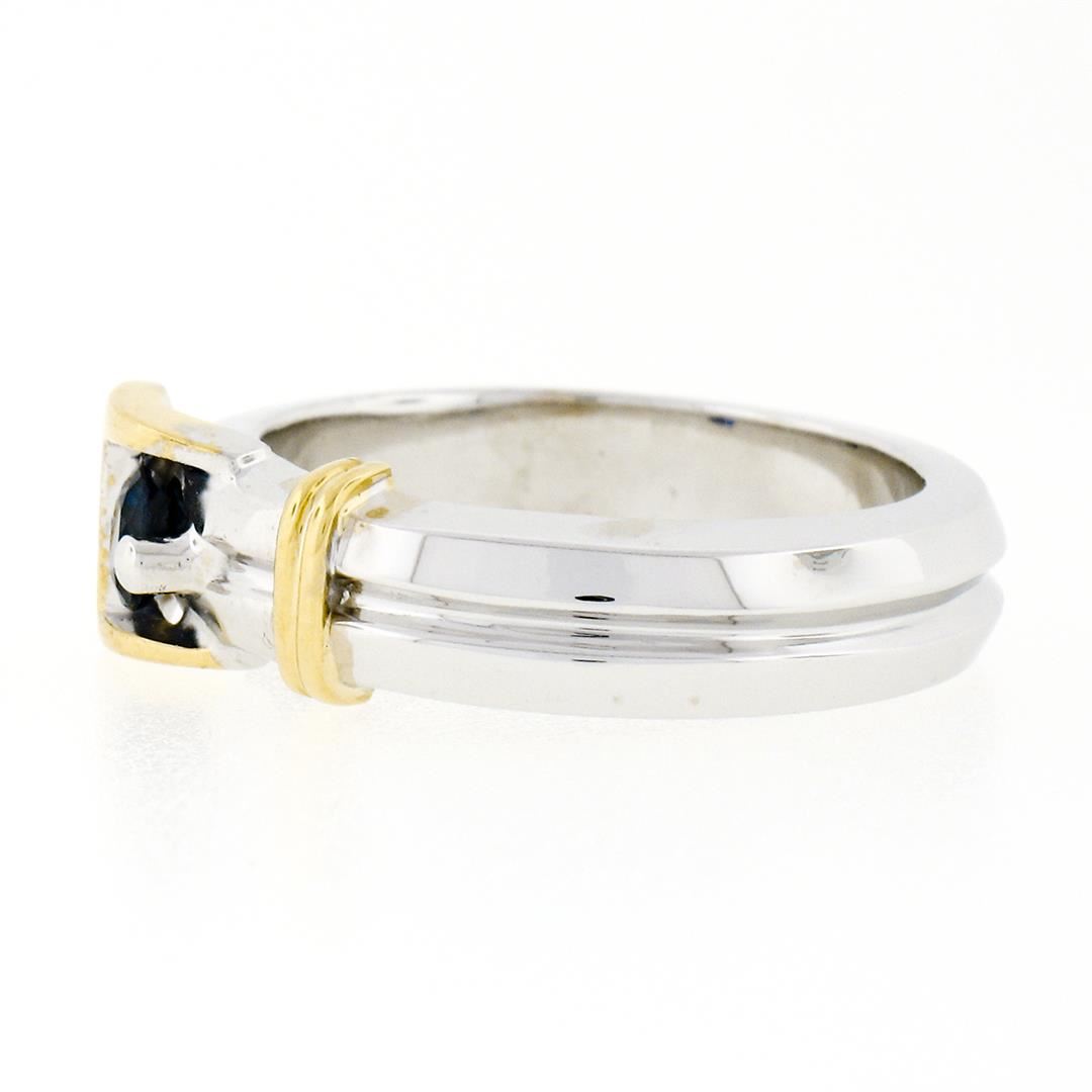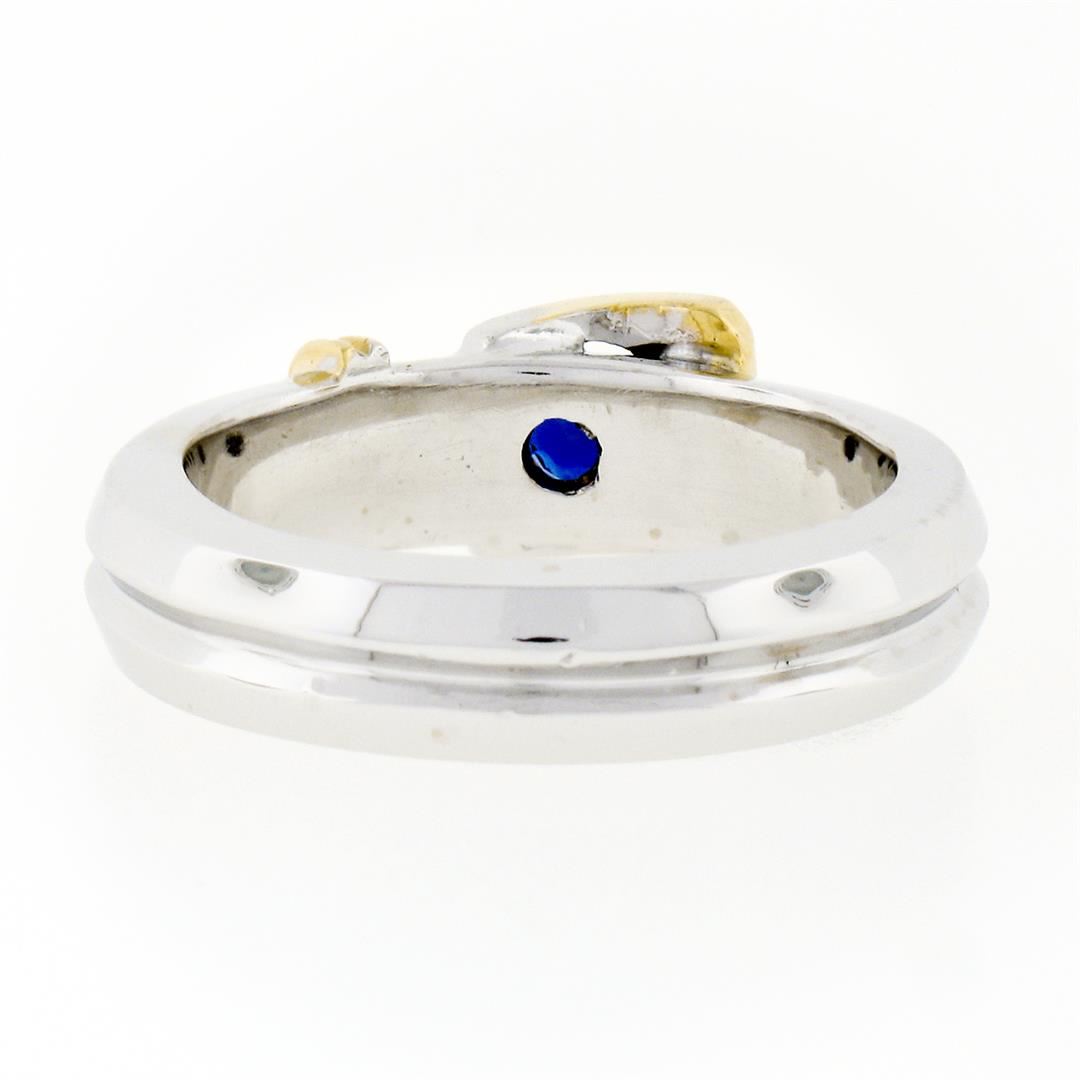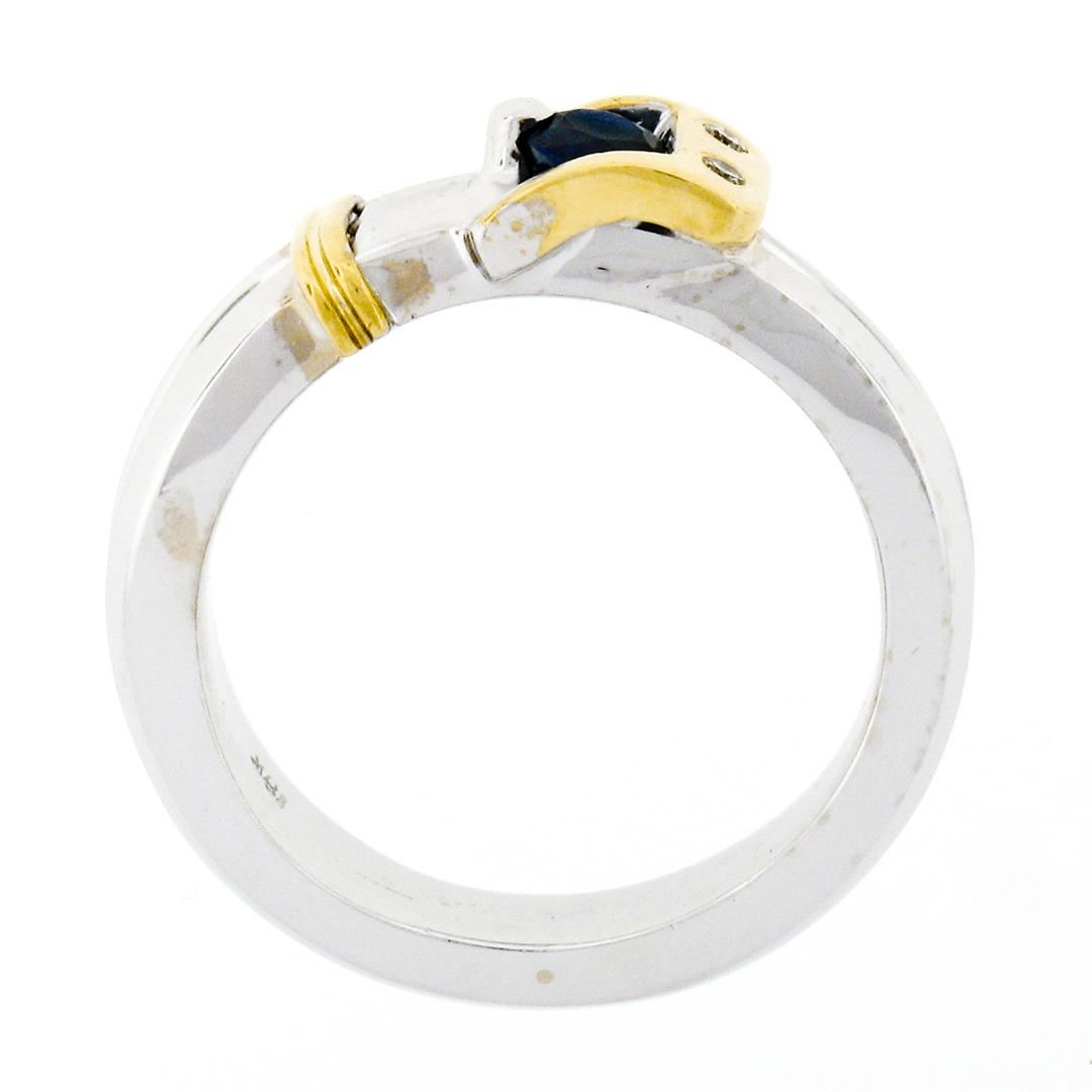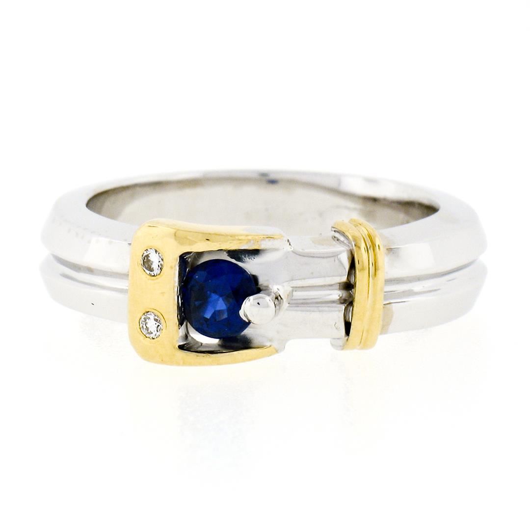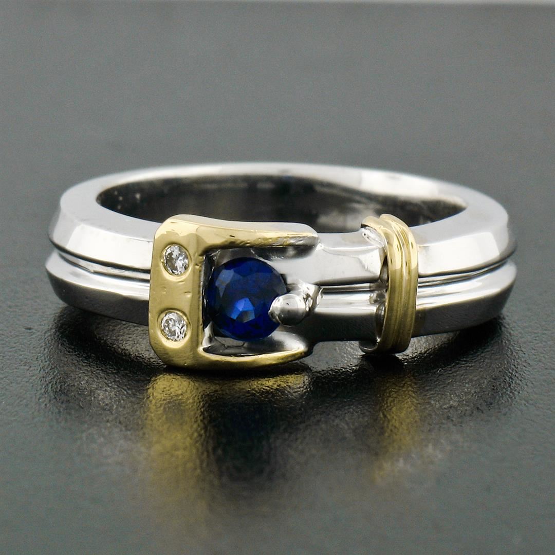 An estate solid 18k white & yellow gold buckle band ring, with 1 round brilliant cut natural sapphire (0.34ct), and 2 round brilliant cut natural diamonds (G - VS2 ; 0.04ctw). The ring is size 6.5, weighs a total of 9.60 grams, and measures 6.83mm wide.