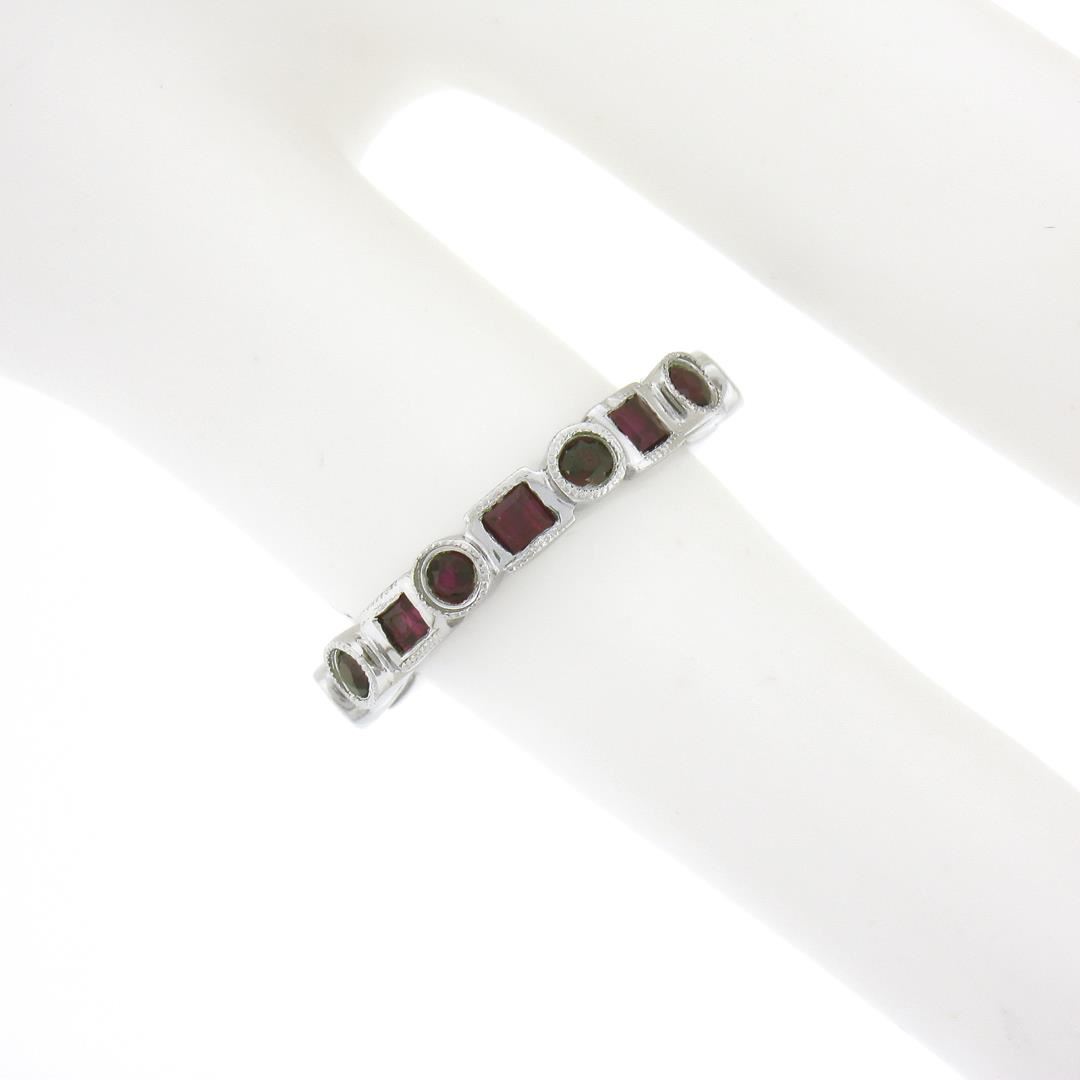 A solid 18k white gold ring, with 9 round brilliant cut & 9 square cut natural rubies (1.42ctw). The ring is size 4.0, weighs a total of 3.34 grams, and measures 3.1mm wide.