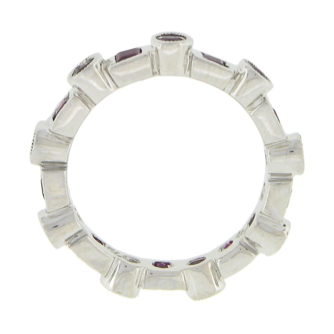 A solid 18k white gold ring, with 9 round brilliant cut & 9 square cut natural rubies (1.42ctw). The ring is size 4.0, weighs a total of 3.34 grams, and measures 3.1mm wide.