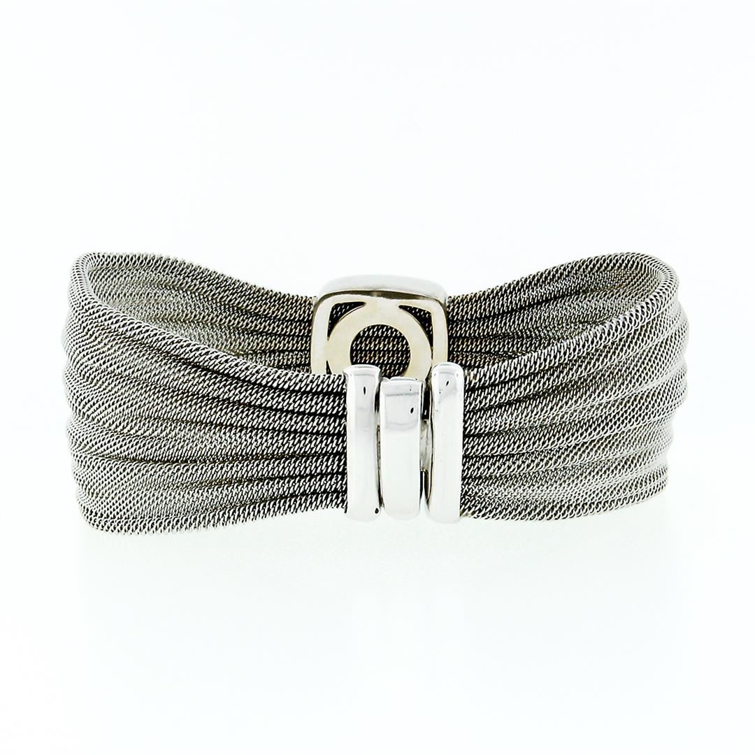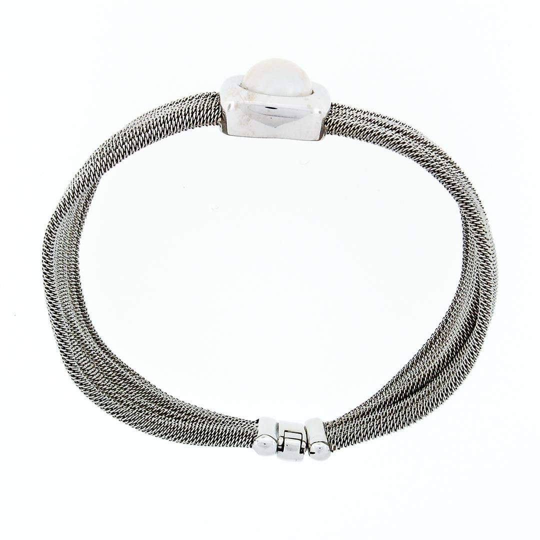 A solid 18k white gold scrunched mesh bracelet with 1 round top mabe pearl (10mm). It weighs a total of 30.97 grams, measures 26mm wide, and measures 6.5 inches in length.
