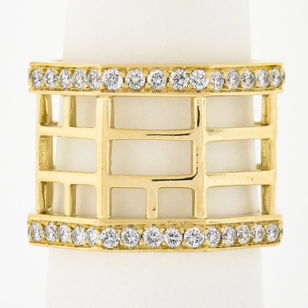 a solid 18k yellow gold wide band ring, with 80 round cut natural diamonds (F/G - VS1/VS2 ; 1.40ctw). The ring is size 6.5, weighs a total of 10.63 grams, and measures 15mm wide.