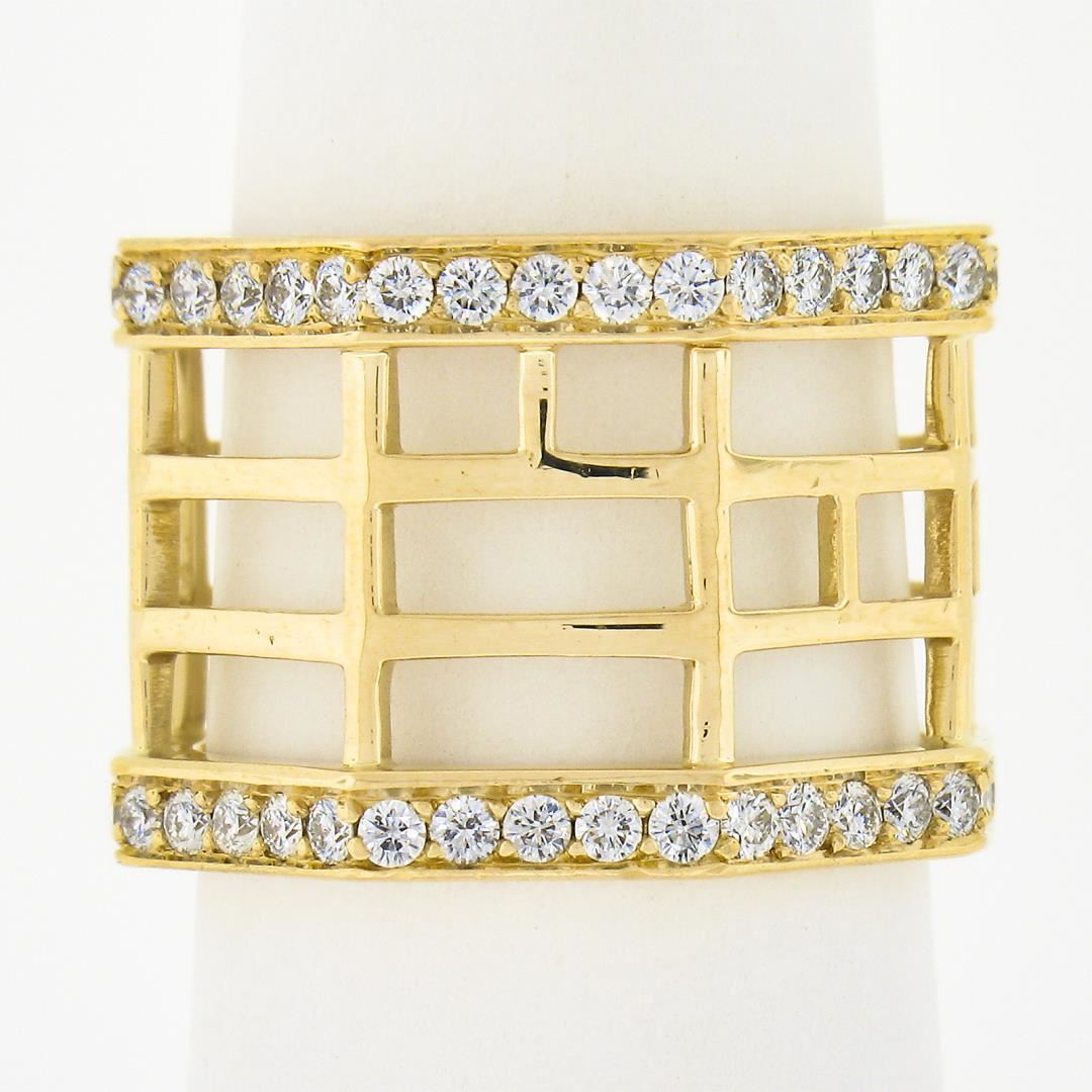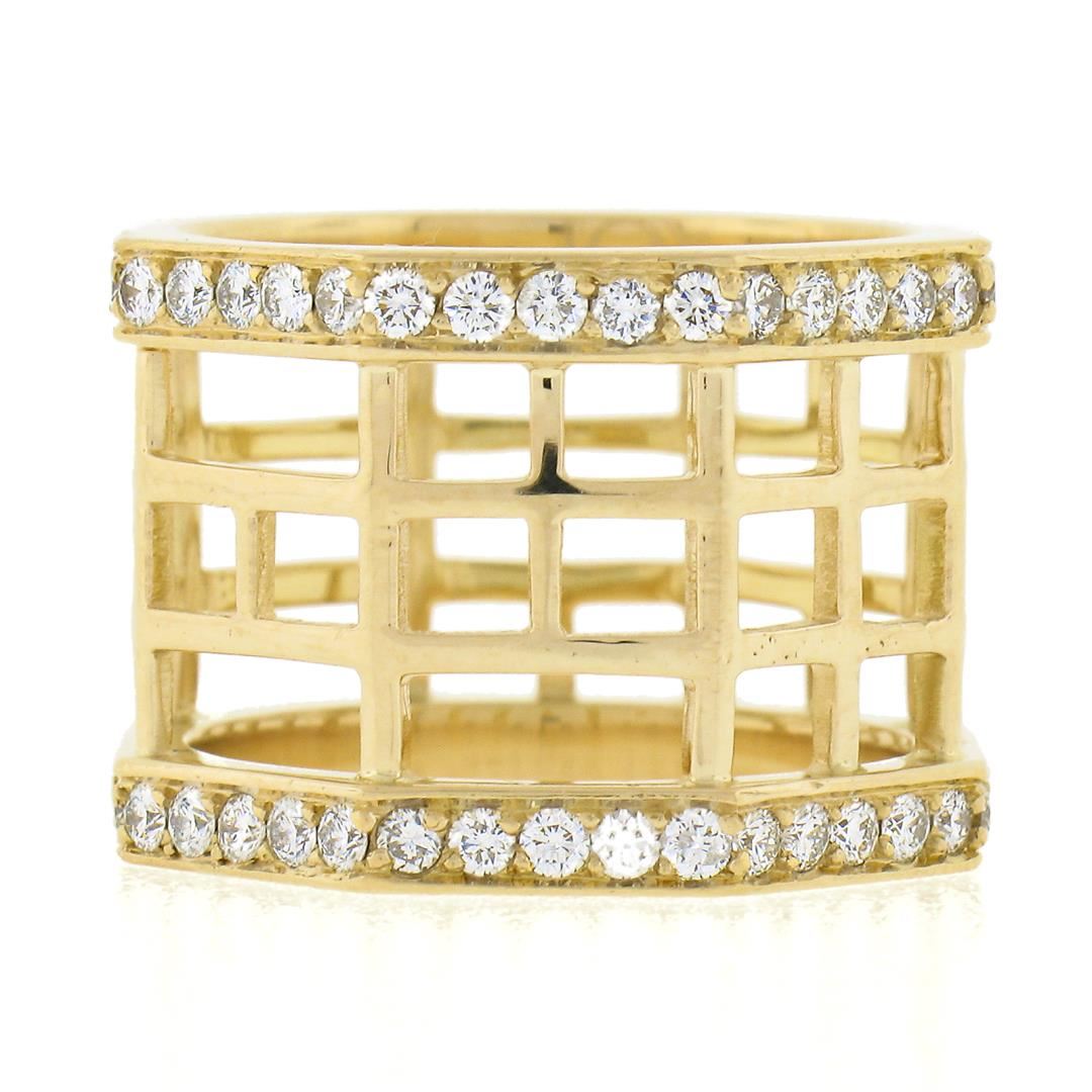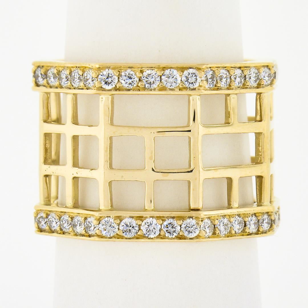 a solid 18k yellow gold wide band ring, with 80 round cut natural diamonds (F/G - VS1/VS2 ; 1.40ctw). The ring is size 6.5, weighs a total of 10.63 grams, and measures 15mm wide.