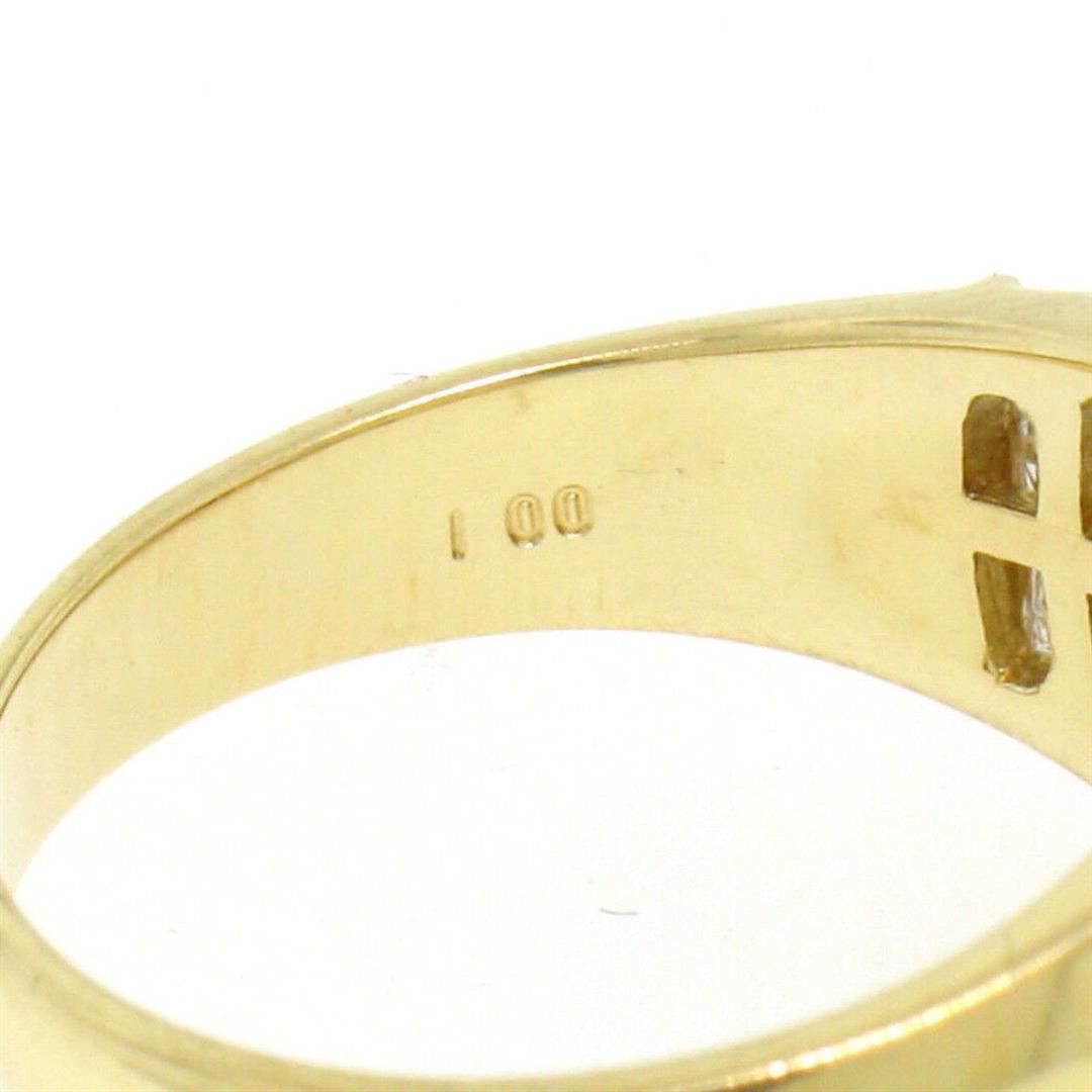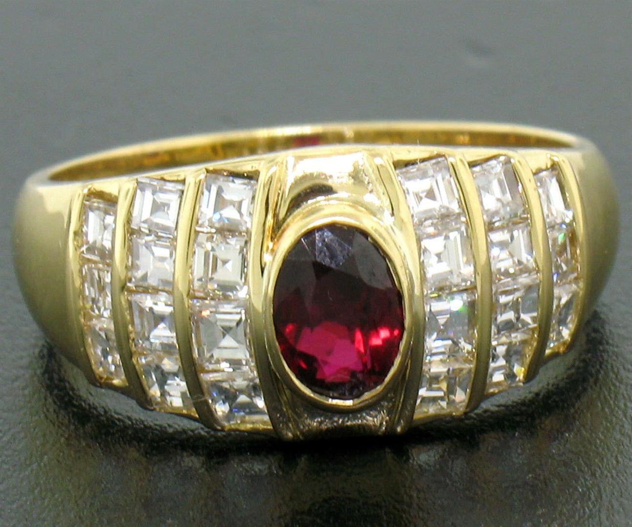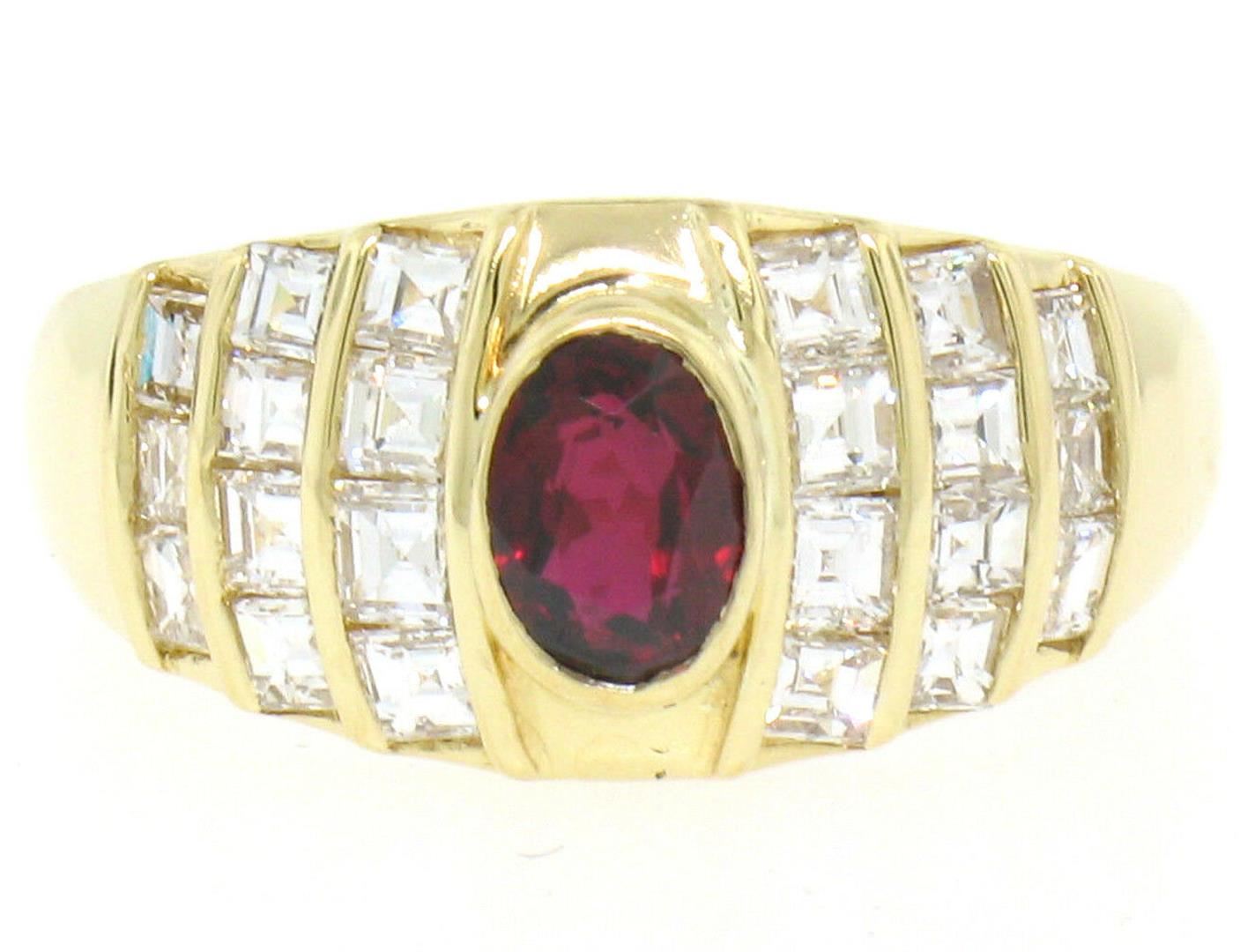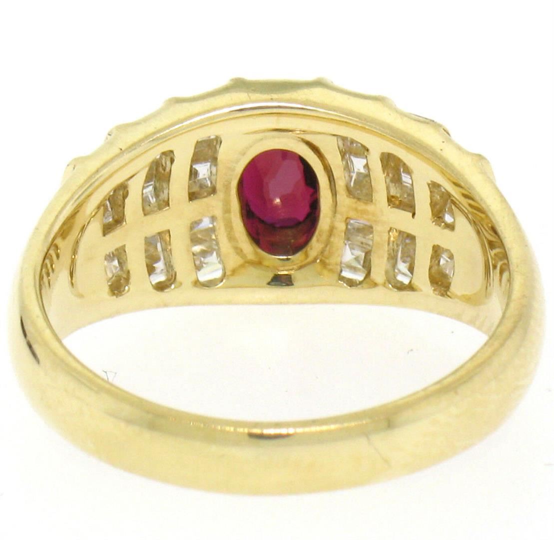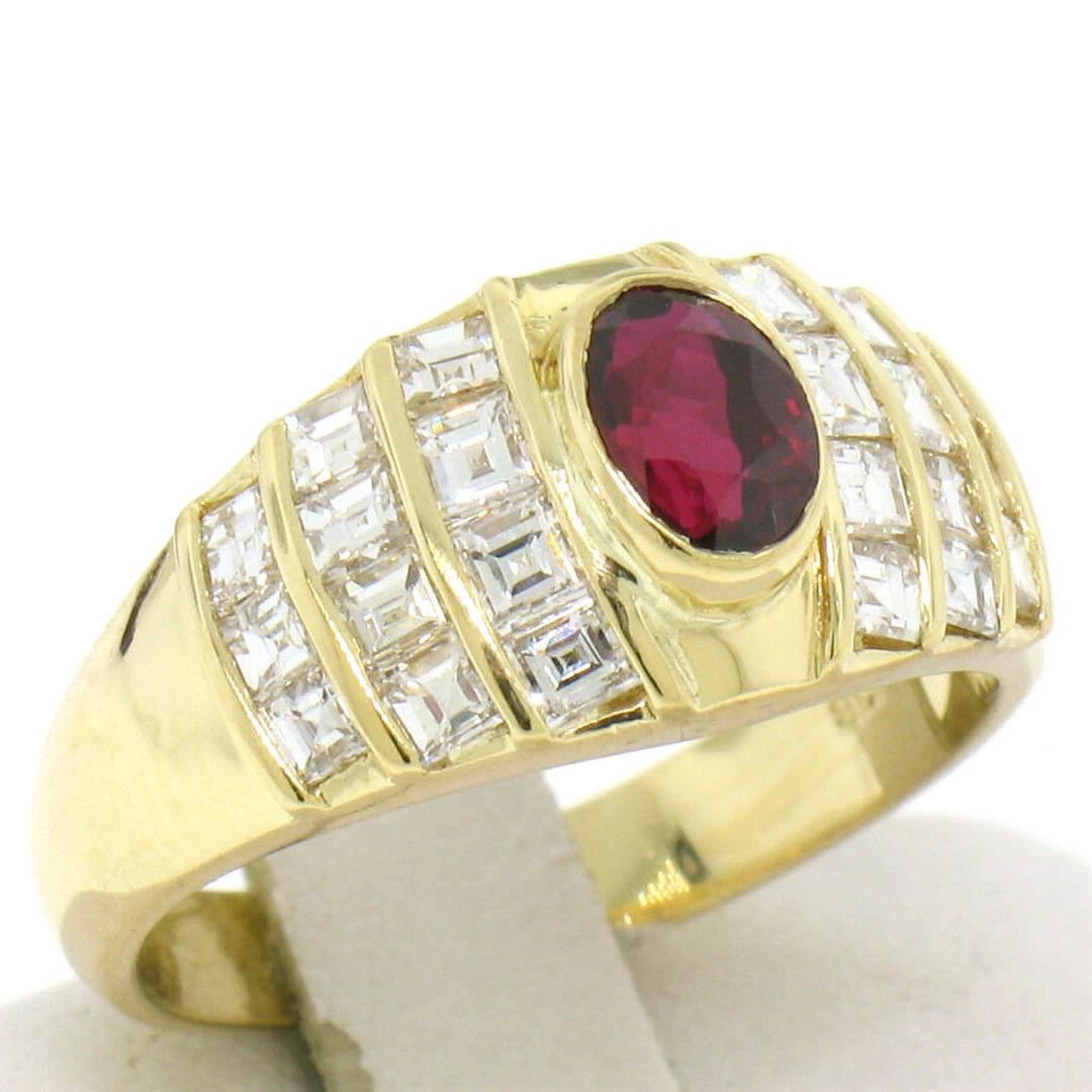 An 18k yellow gold wide band ring featuring a 0.75ct bezel set oval ruby accented by 1.00ctw of Asscher cut diamonds (D/E - VVS2). The ring is size 6.0, weighs a total of 5.80 grams, and measures 9.15mm wide.