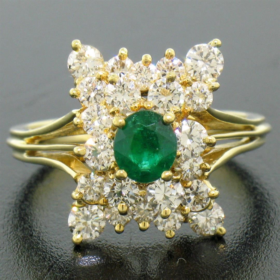 Estate 18k Yellow Gold 1.78ctw Oval Emerald & Round Diamond Pyramid Cluster Ring. Please see photos and description for all available information. An estate solid 18k yellow gold pyramid cluster Rring, Featuring 1 oval cut natural emerald (0.48ct), surrounded with a halo of 22 round brilliant cut natural diamonds (G/H- VS1; 1.30ctw). The ring is size 7.0, weighs a total of 5.7 grams, and measures 12.0mm wide.