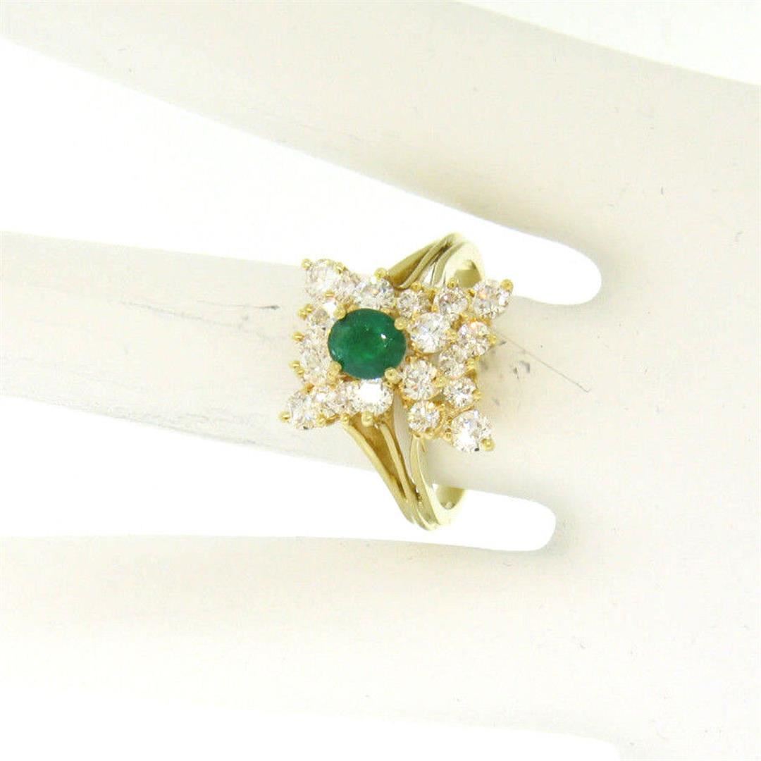 Estate 18k Yellow Gold 1.78ctw Oval Emerald & Round Diamond Pyramid Cluster Ring. Please see photos and description for all available information. An estate solid 18k yellow gold pyramid cluster Rring, Featuring 1 oval cut natural emerald (0.48ct), surrounded with a halo of 22 round brilliant cut natural diamonds (G/H- VS1; 1.30ctw). The ring is size 7.0, weighs a total of 5.7 grams, and measures 12.0mm wide.