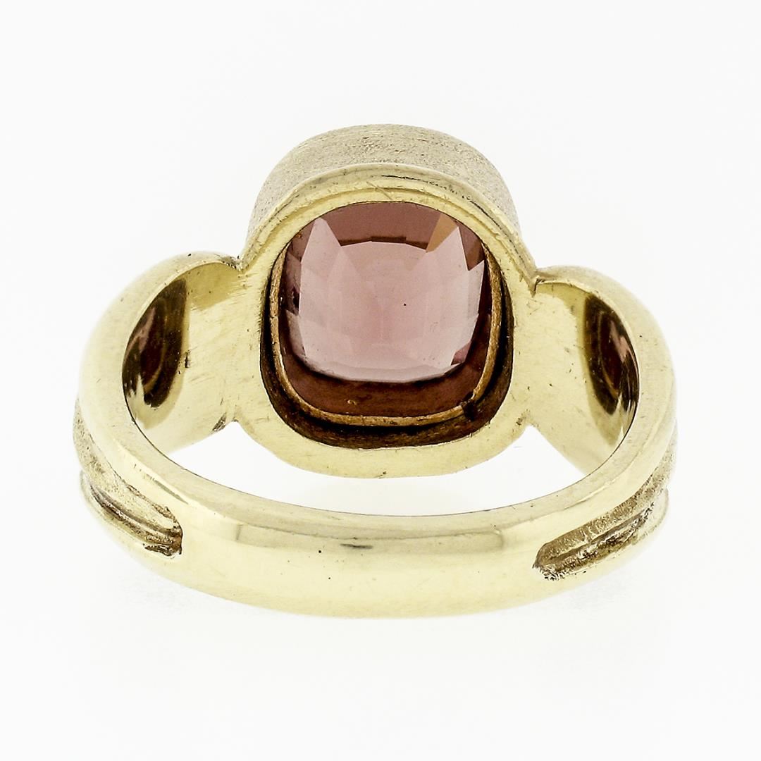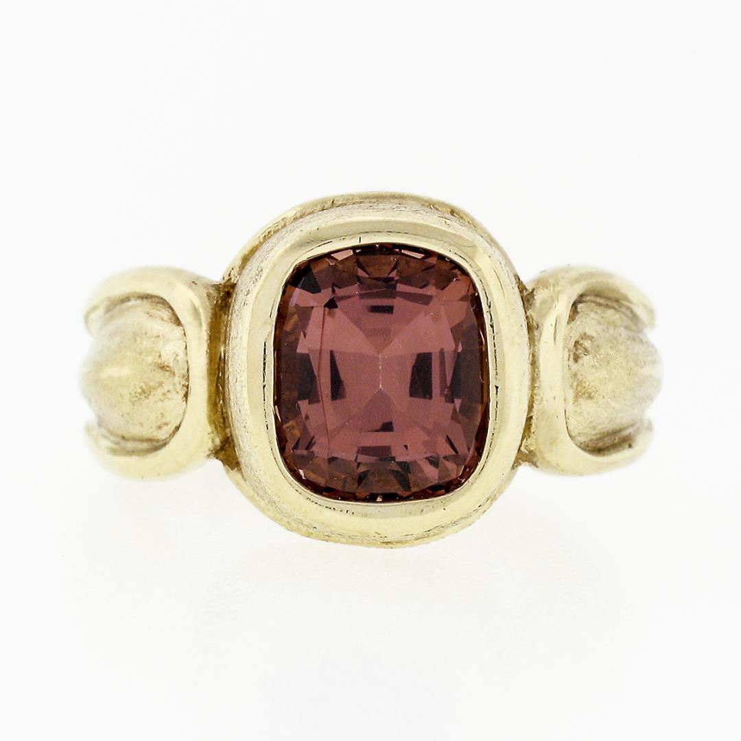 A solid 18k yellow gold ring, with 1 cushion cut natural garnet (2.38ct). The ring is size 6.5, weighs a total of 9.82 grams, and measures 12.14mm wide.