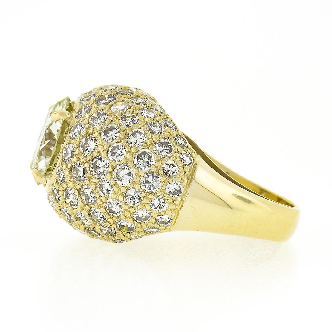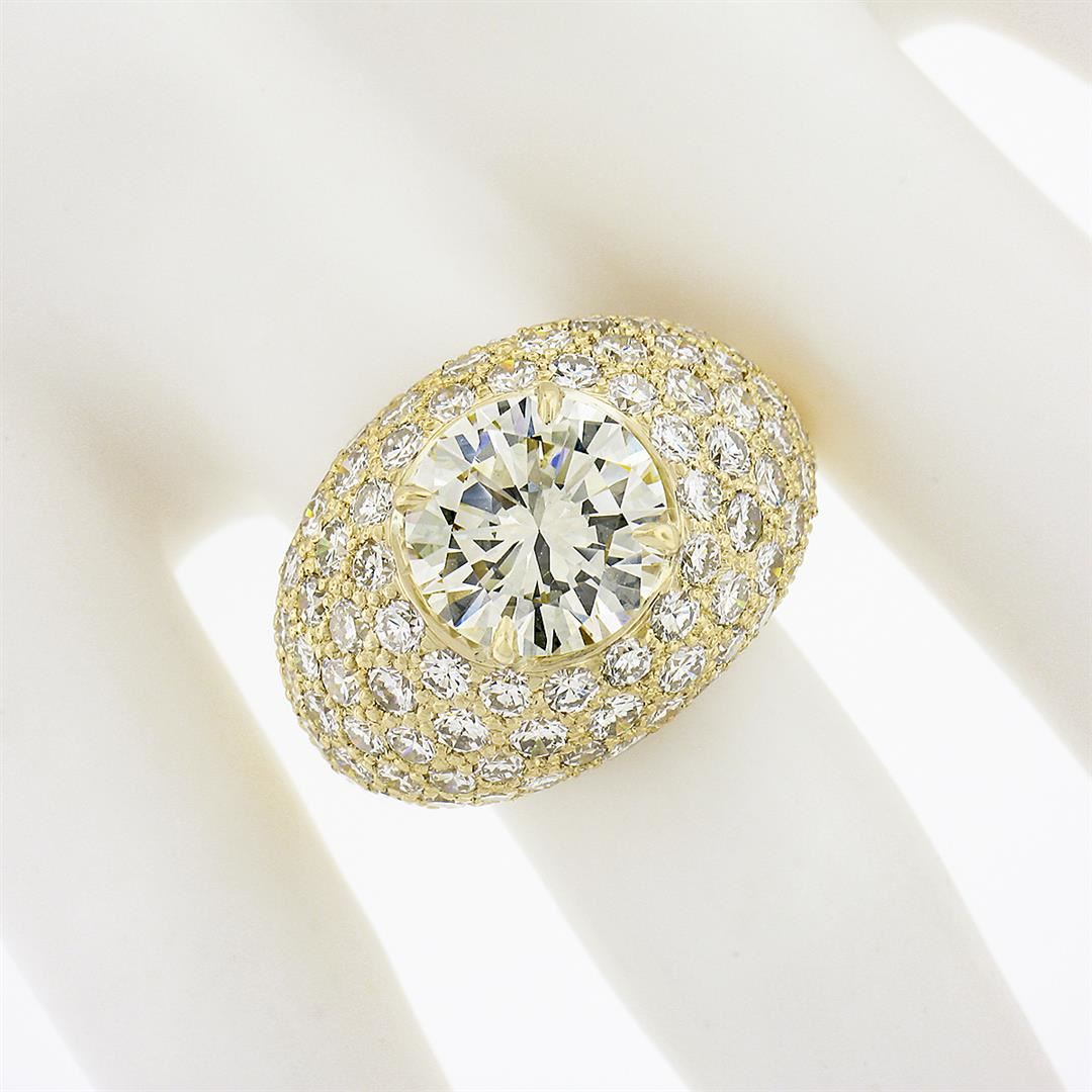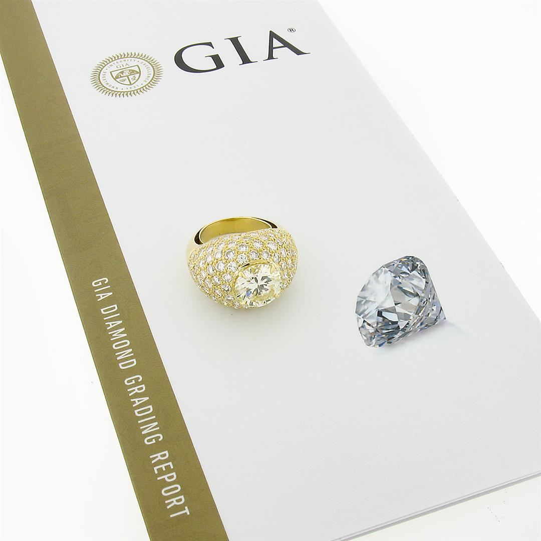 A solid 18k yellow gold band ring, with 1 Gia certified round brilliant cut natural diamond (N - VVS2 ; 3.55ct), and 120 round brilliant cut natural diamonds (E/F - VVS2/VS1 ; 4.40ctw). The ring is size 5.5, weighs a total of 10.56 grams, and measures 16.