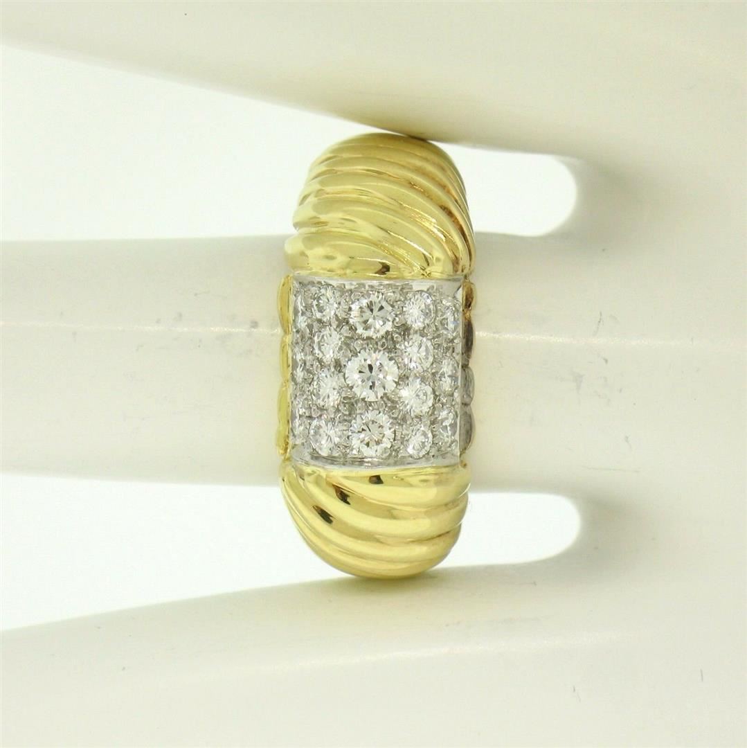 One Estate 18k Yellow Gold Scalloped & Ribbed E VVS2 1.01ctw Pave Set Diamond Ring. Item Details: Material: 18K Solid Yellow Gold , Weight: 12.7 Grams , Stone: (17) Natural Genuine Diamonds - Round Brilliant Cut - Pave Set - E/F Color - VVS2/VS1 Clarity - 1.01ctw (approx.), Size: 8.0, Width: 10.36mm, Height: 7.20mm rise off the finger, Condition: Like New and ready to wear.