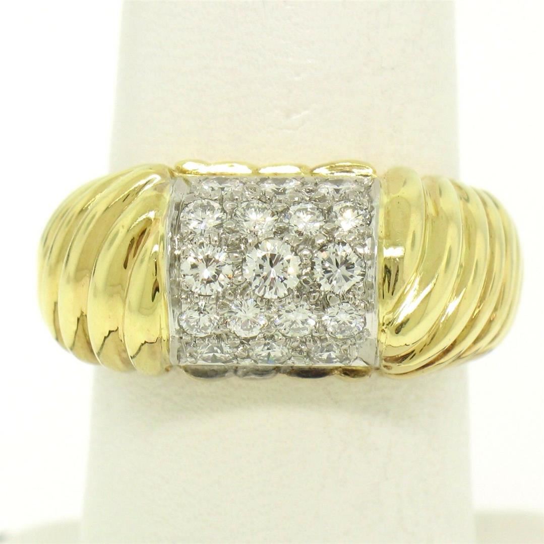 One Estate 18k Yellow Gold Scalloped & Ribbed E VVS2 1.01ctw Pave Set Diamond Ring. Item Details: Material: 18K Solid Yellow Gold , Weight: 12.7 Grams , Stone: (17) Natural Genuine Diamonds - Round Brilliant Cut - Pave Set - E/F Color - VVS2/VS1 Clarity - 1.01ctw (approx.), Size: 8.0, Width: 10.36mm, Height: 7.20mm rise off the finger, Condition: Like New and ready to wear.