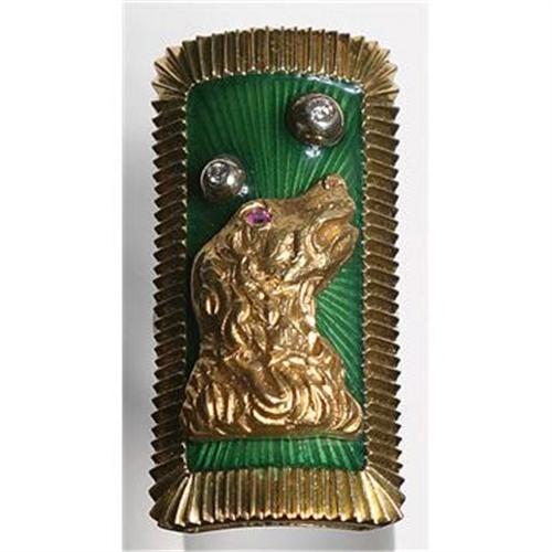 Many of you know me from my five years of national jewelry television shows, Estate Jewelry with Sam and Lisa and Jewelry and Collectables with Lisa. Now I am honored to present these beautiful antique and estate finds to you through Go Antiques. Here is a most unique and lovely estate ring. It is handmade of 18Kt yellow gold featuring a beautiful solid gold raised golden retreiver with a ruby eye. The green enamel is pristine. It also has 2 bezel set diamonds in white gold. The ring is currently a sizeable 9. It measures 1.75" x 1" and weighs 30.7 grams. If you bid on this piece and do not win it, please visit my online store by clicking ?view this dealers other items? to see if it is still available for direct sale or offers. Need Ring Sizing? Ask me about wholesale sizing prices. Personal shopping requests can be sent to ?email dealer?. Help make adoption a reality! Add a $4.00 ?Orphans R Gems? ?Support Adoption? blue silicone bracelet to your order or visit my non-profit Orphans R Gems website.