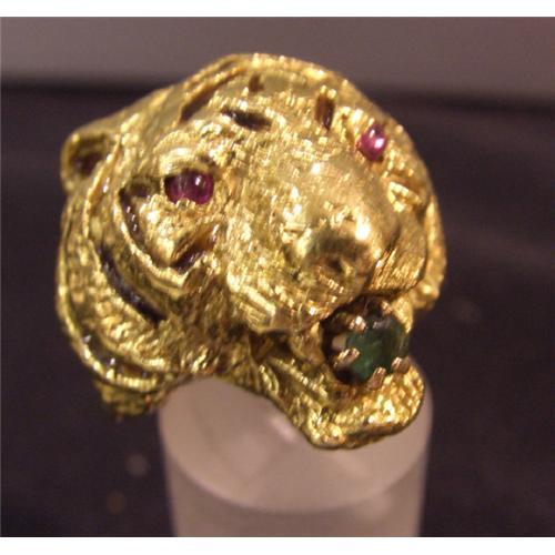 <tr><td>Title:Estate 18kt Gold Ruby Enamel Emerald Tiger Ring</td></tr>