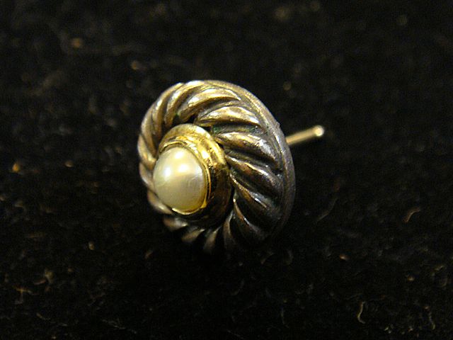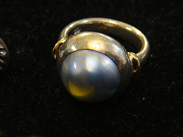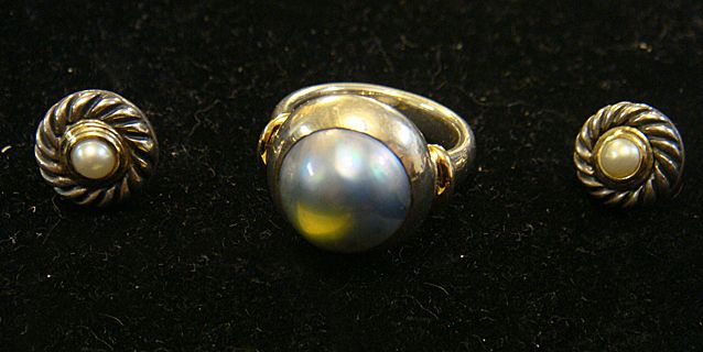 Estate 18kt Gold and Sterling Silver Ladies Ring with colored pearl, along with sterling silver with 14kt gold pair of pearl ladies earrings.