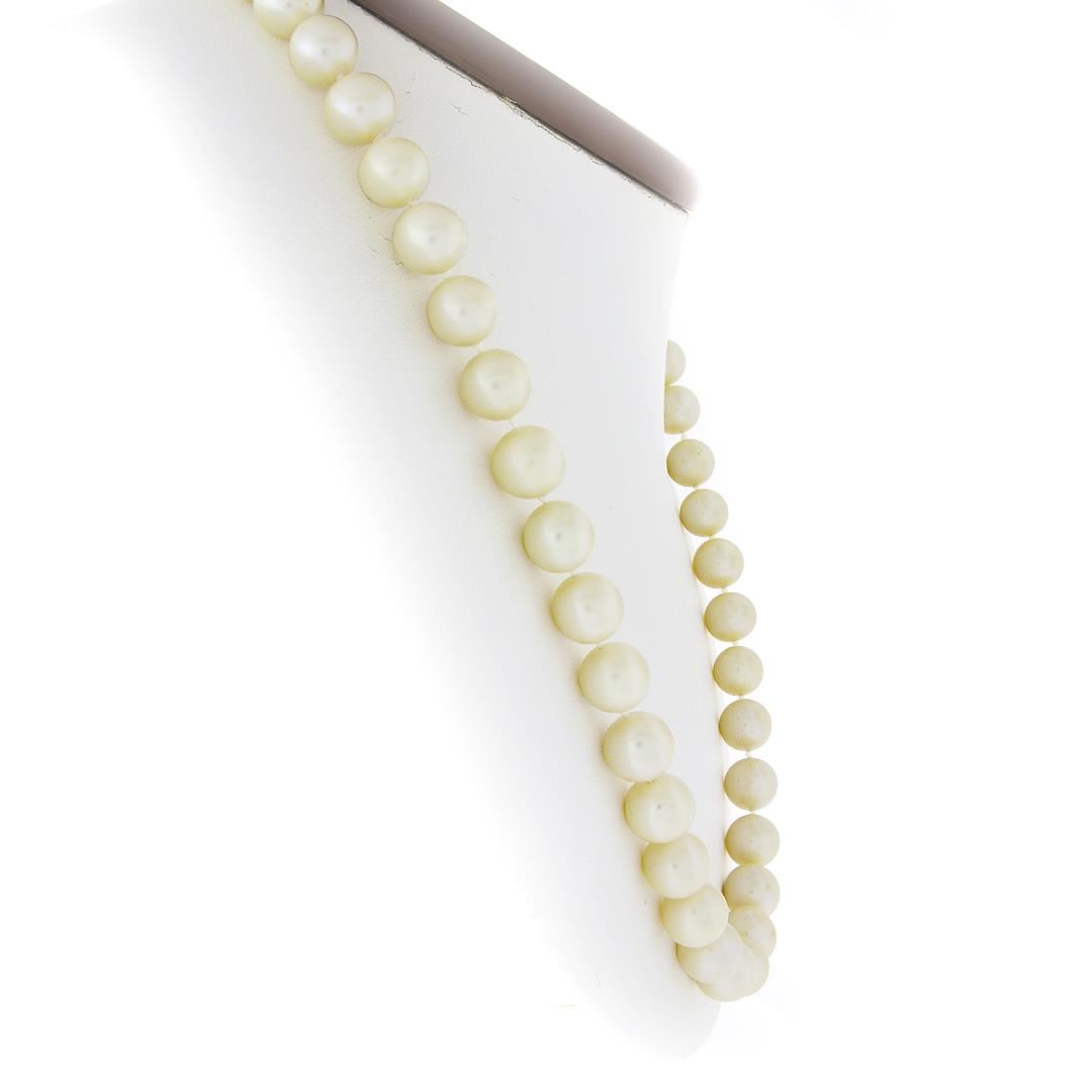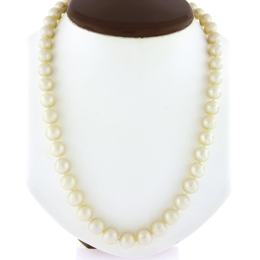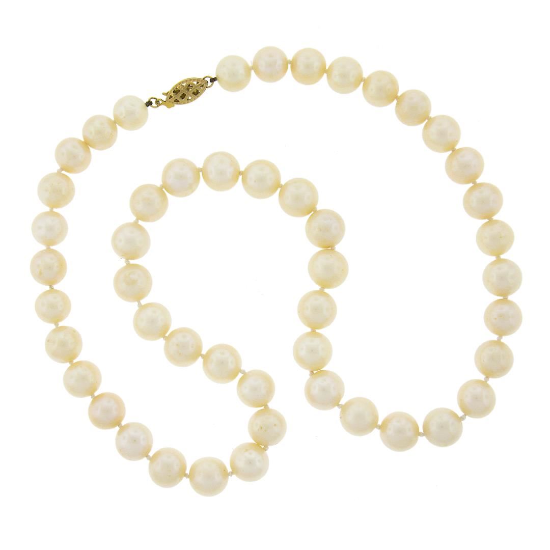 A strand necklace with 14k yellow gold clasp, featuring 48 round shape cultured pearls (8.5-9.5mm). It weighs a total of 49.65 grams, measures 9.5mm wide, and measures 19 inches in length.