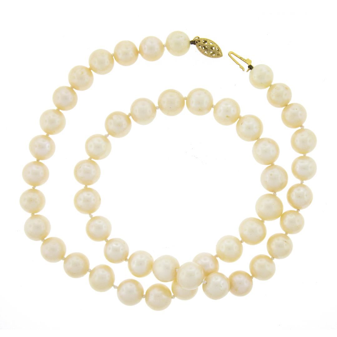 A strand necklace with 14k yellow gold clasp, featuring 48 round shape cultured pearls (8.5-9.5mm). It weighs a total of 49.65 grams, measures 9.5mm wide, and measures 19 inches in length.