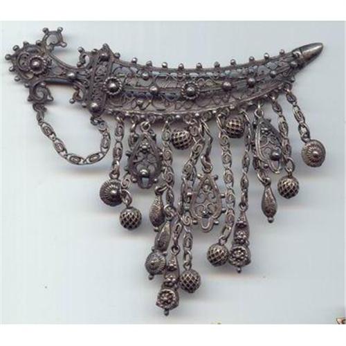 This magnificent brooch measures 4 1/4 inches wide and 4 inches tall. It is antiqued silvertone metal with lovely filigree work and hanging charms. The brooch is in MINT condition with a secure locking safety clasp. It is not signed.