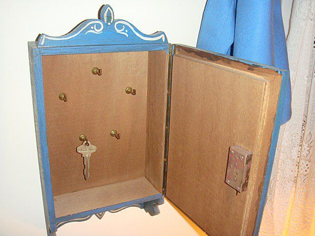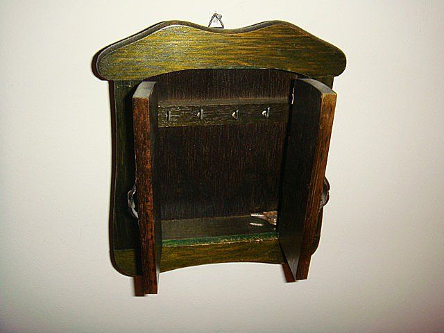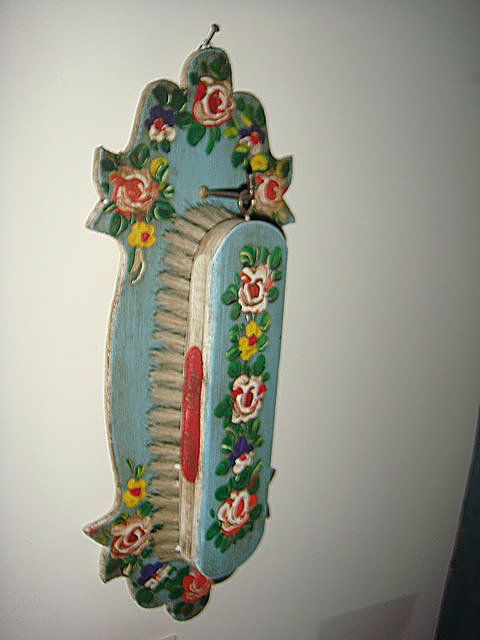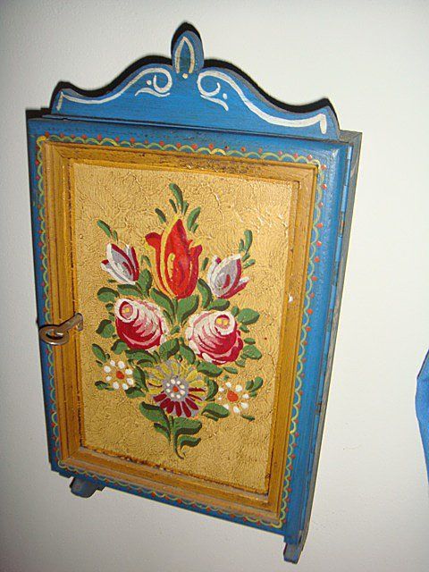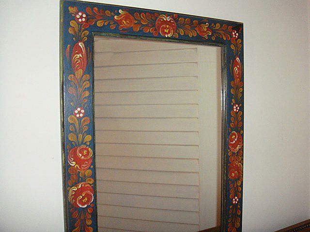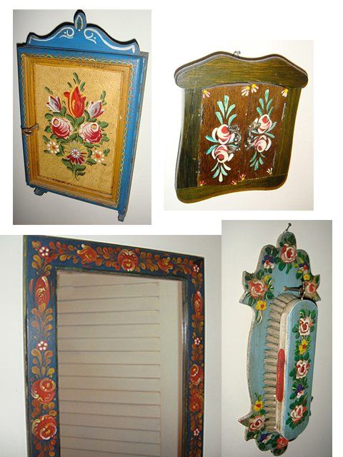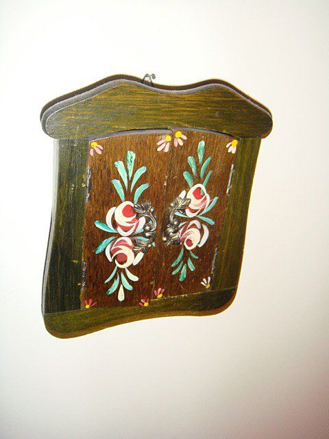 Estate 4 Piece Decorative Lot, including mirror with blue bakground and flowers painted all around, hanging brush blue with red flowers, key holder with doors that close to hide keys, painted key holder with full flower floral painting on from, carved top and bottom, blue background, has original key from locking.