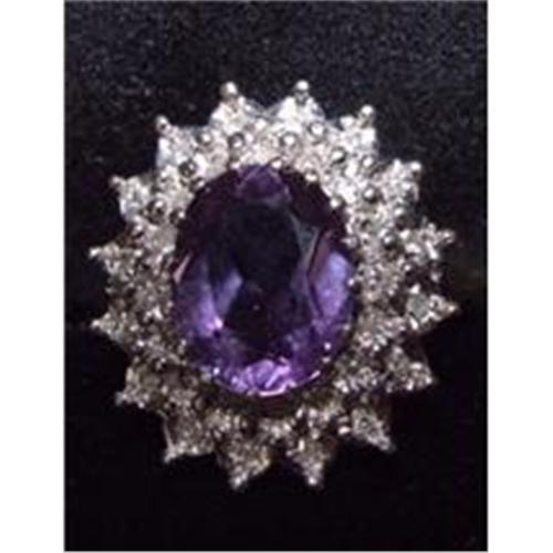 Many of you know me from my five years of national jewelry television shows, Estate Jewelry with Sam and Lisa and Jewelry and Collectables with Lisa LePaige and BuyRareStuff. Now I am honored to present these beautiful antique and estate finds to you through Go Antiques. This vintage amethyst and diamond ring is so pretty! The oval purple amethyst is approximately 5cts and is surrounded by 36 round brilliant genuine diamonds. The ring is set in 10kt white and yellow gold and weighs 5.0 grams. It is currently a sizeable 10.
