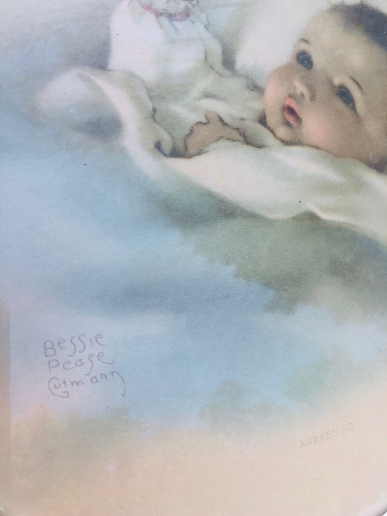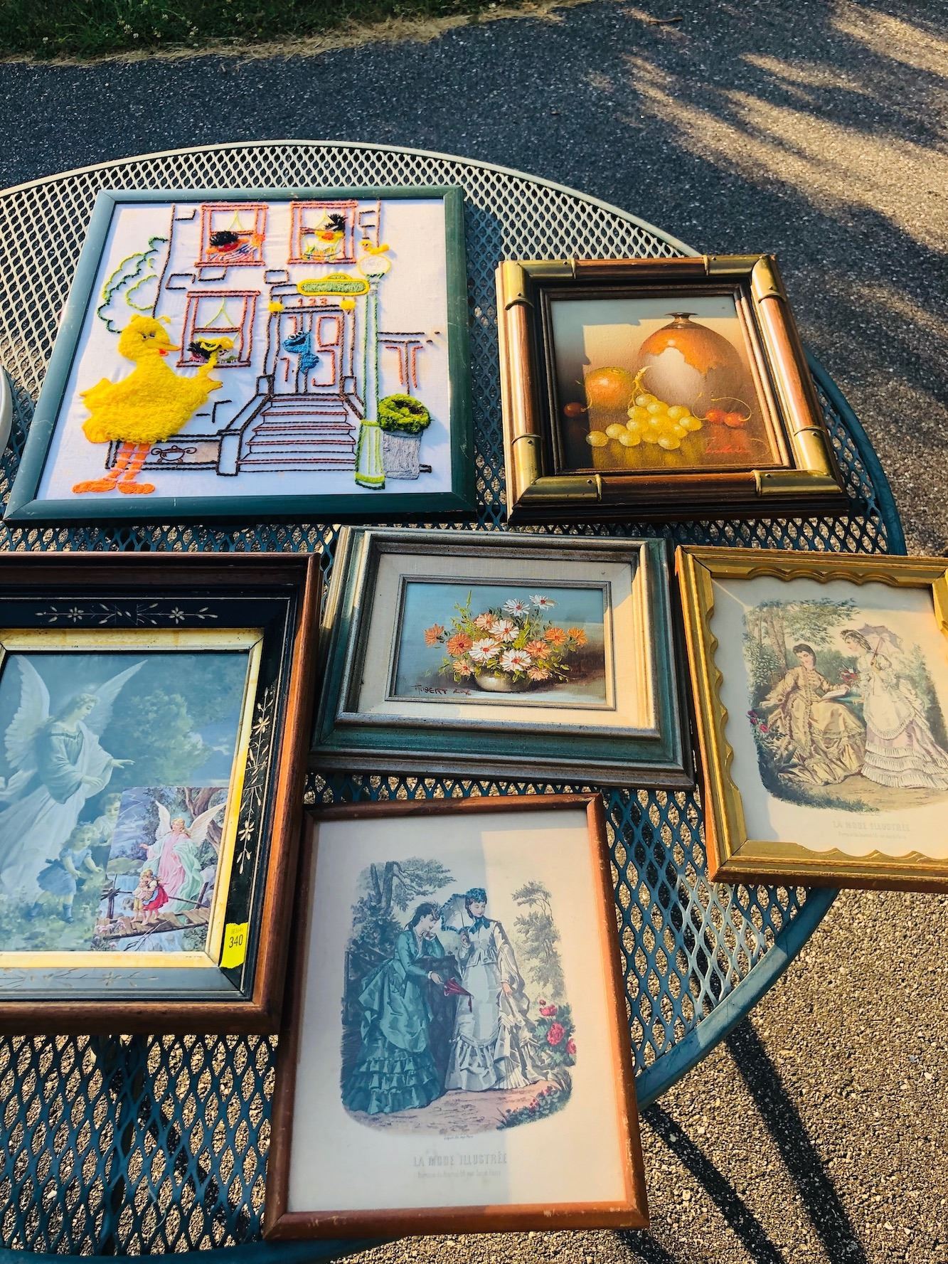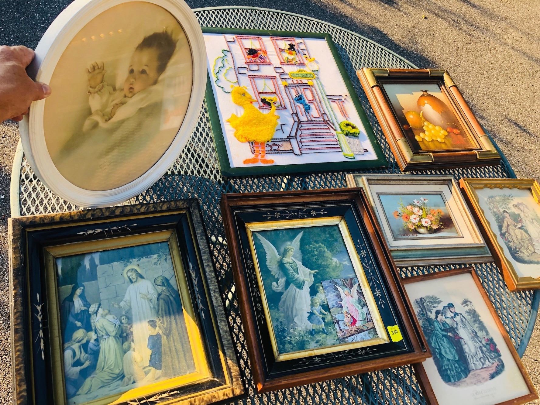 Estate artwork lot includes Godey Girls lithograph, small framed still lifes, religious framed prints, sampler, and Bessie Pease Cutmann baby lithograph.