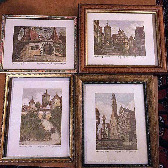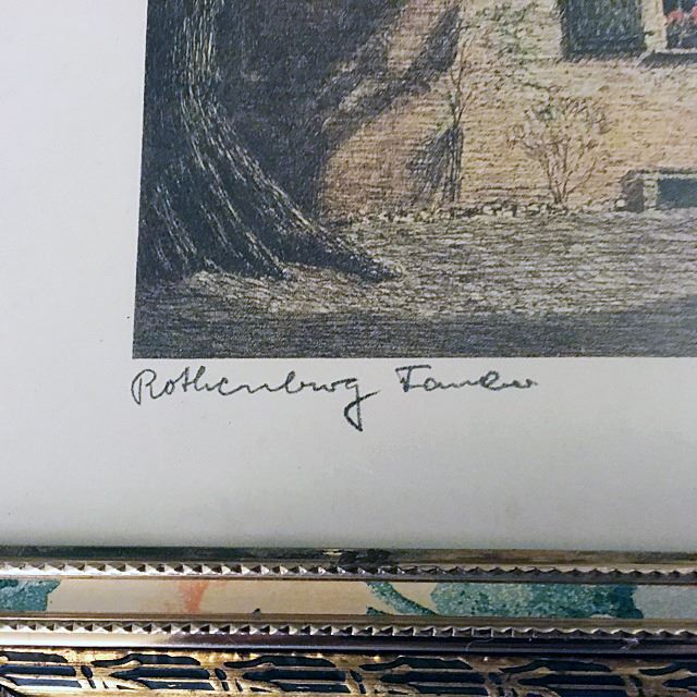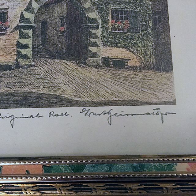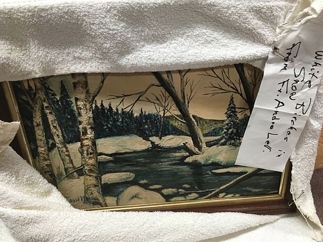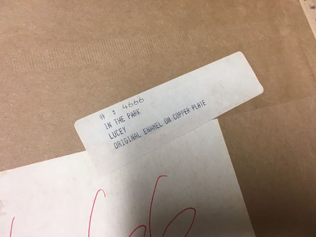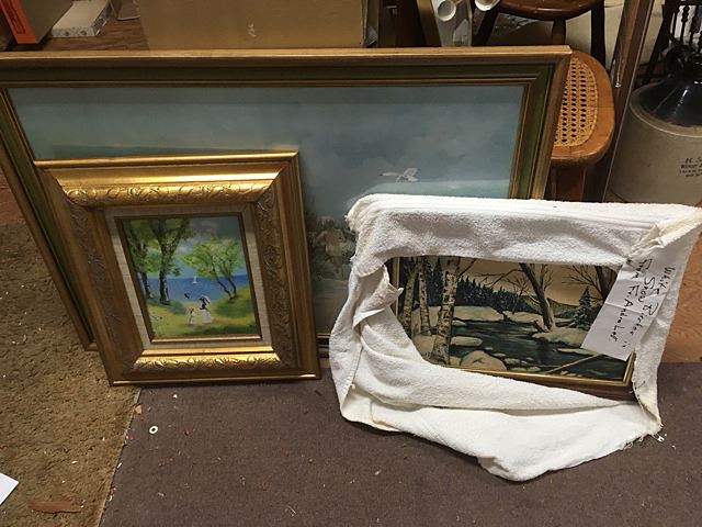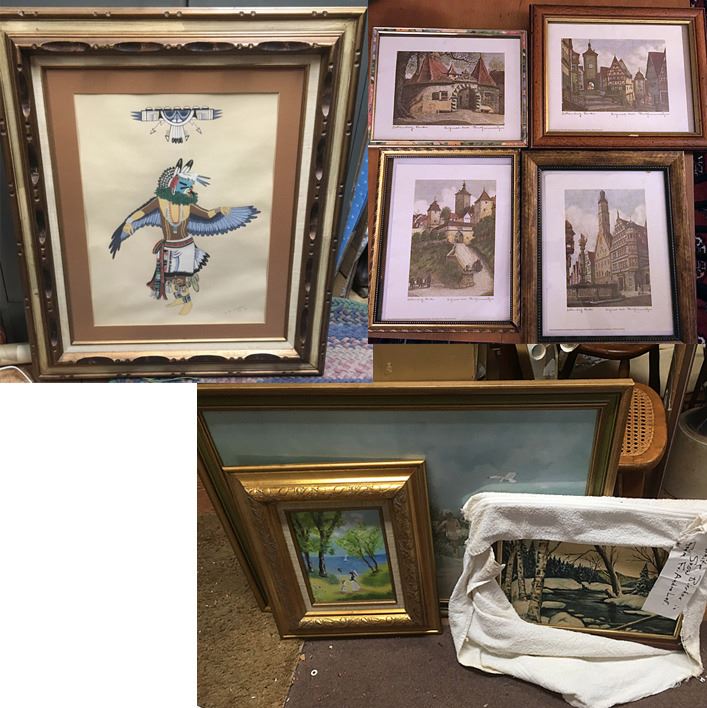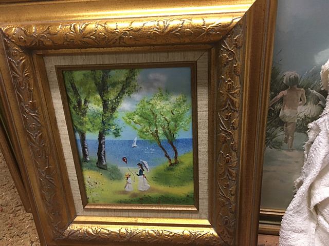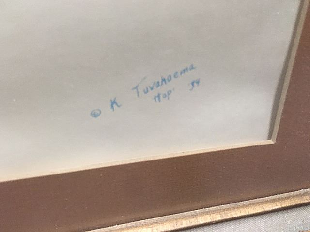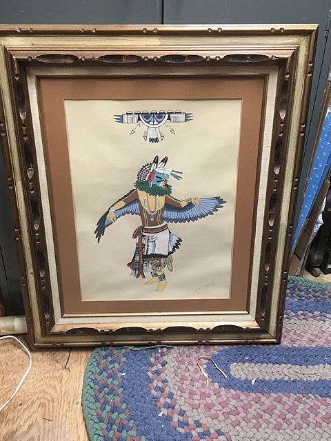 Estate artwork includes birch trees landscape signed E. Cossette, Hopi artwork, professionally framed and matted, signed Tuvahoema, In the Park, Lucey, Original enamel on copper plate, large framed print of little boy on beach.