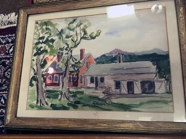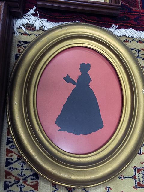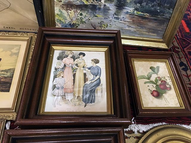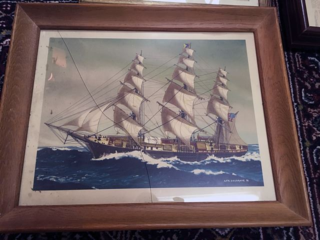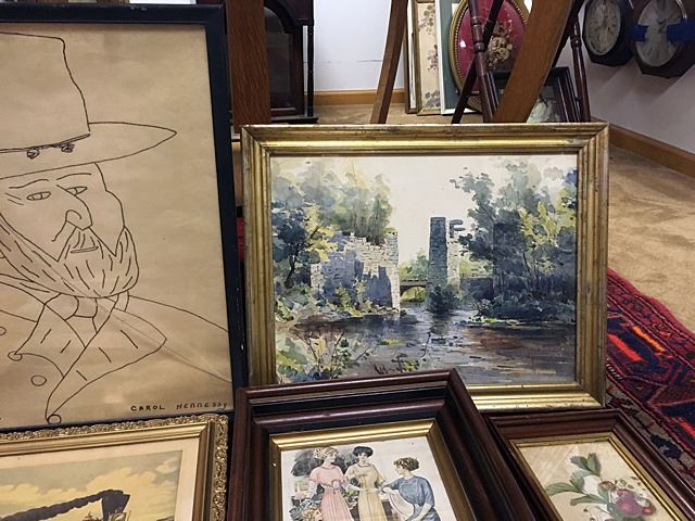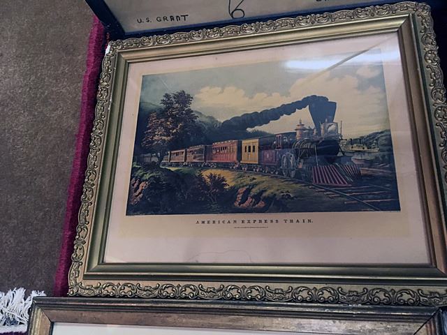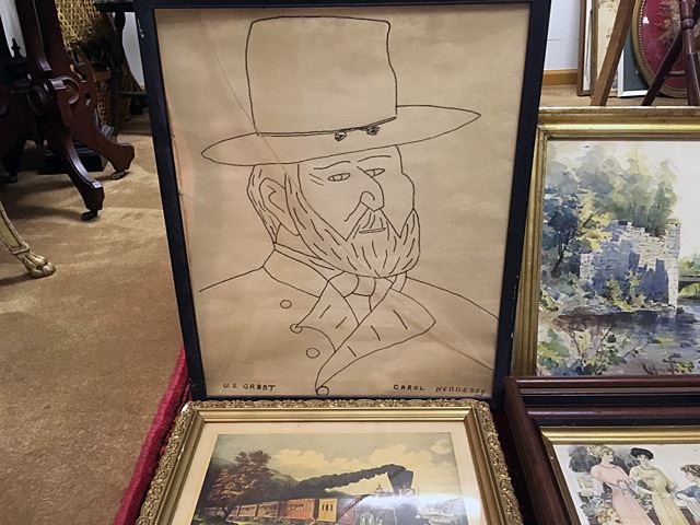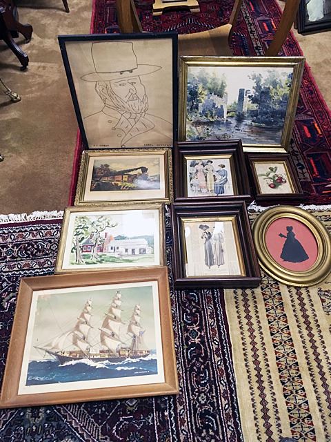 Assorted collection of estate artwork including line drawing signed U.S. Grant, Carol Hennessy, landscape paintings, early train print, sailing ship print, framed fashion prints, silhouette in gold gilt oval frame.