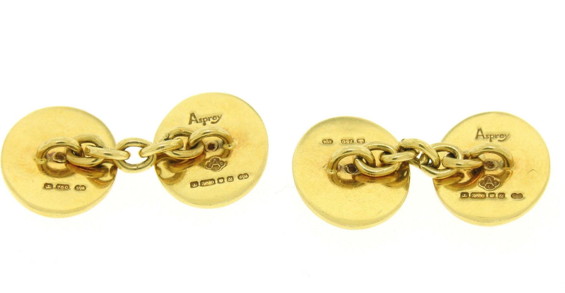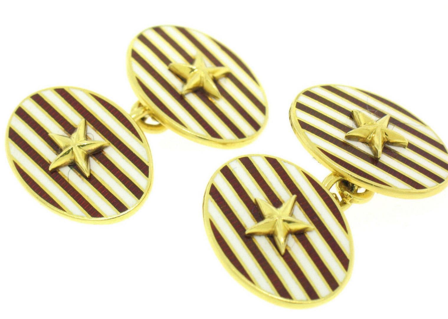A 100% original pair of solid 18k yellow gold cuff links by Asprey featuring red and white enamel stripes with 5-pointed stars at the center of each panel.These cuff links have a chain linked dual panel design, weigh a total of 17.20 grams, and the panels measure 18.9x14.0mm.
