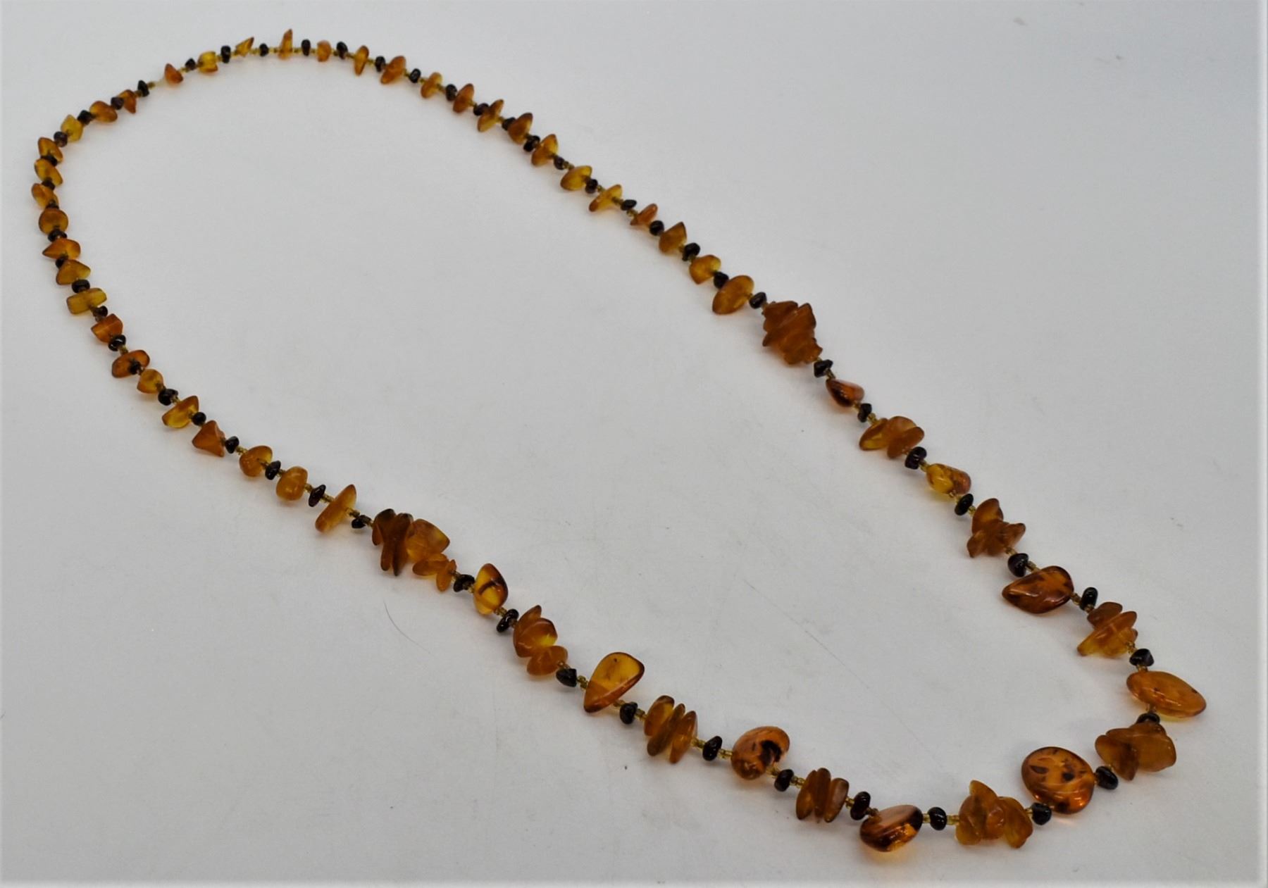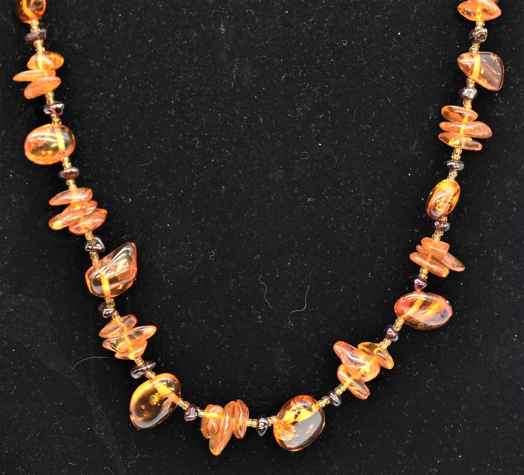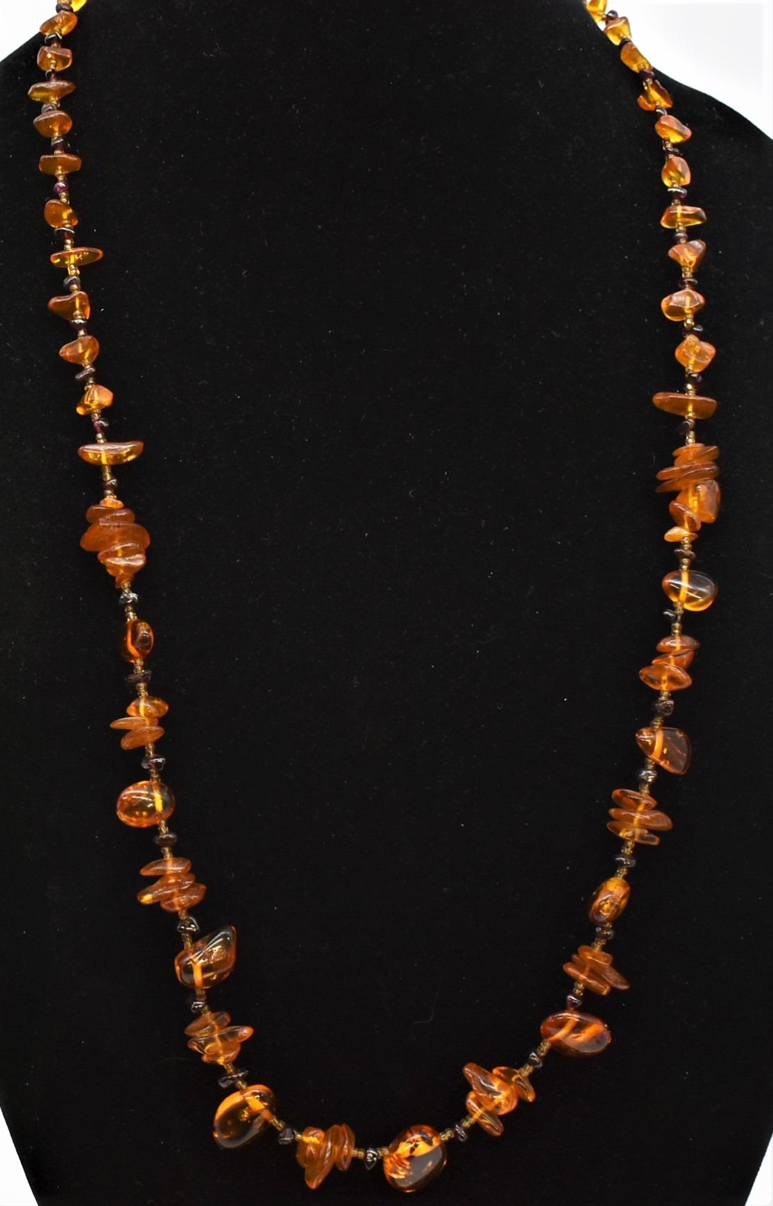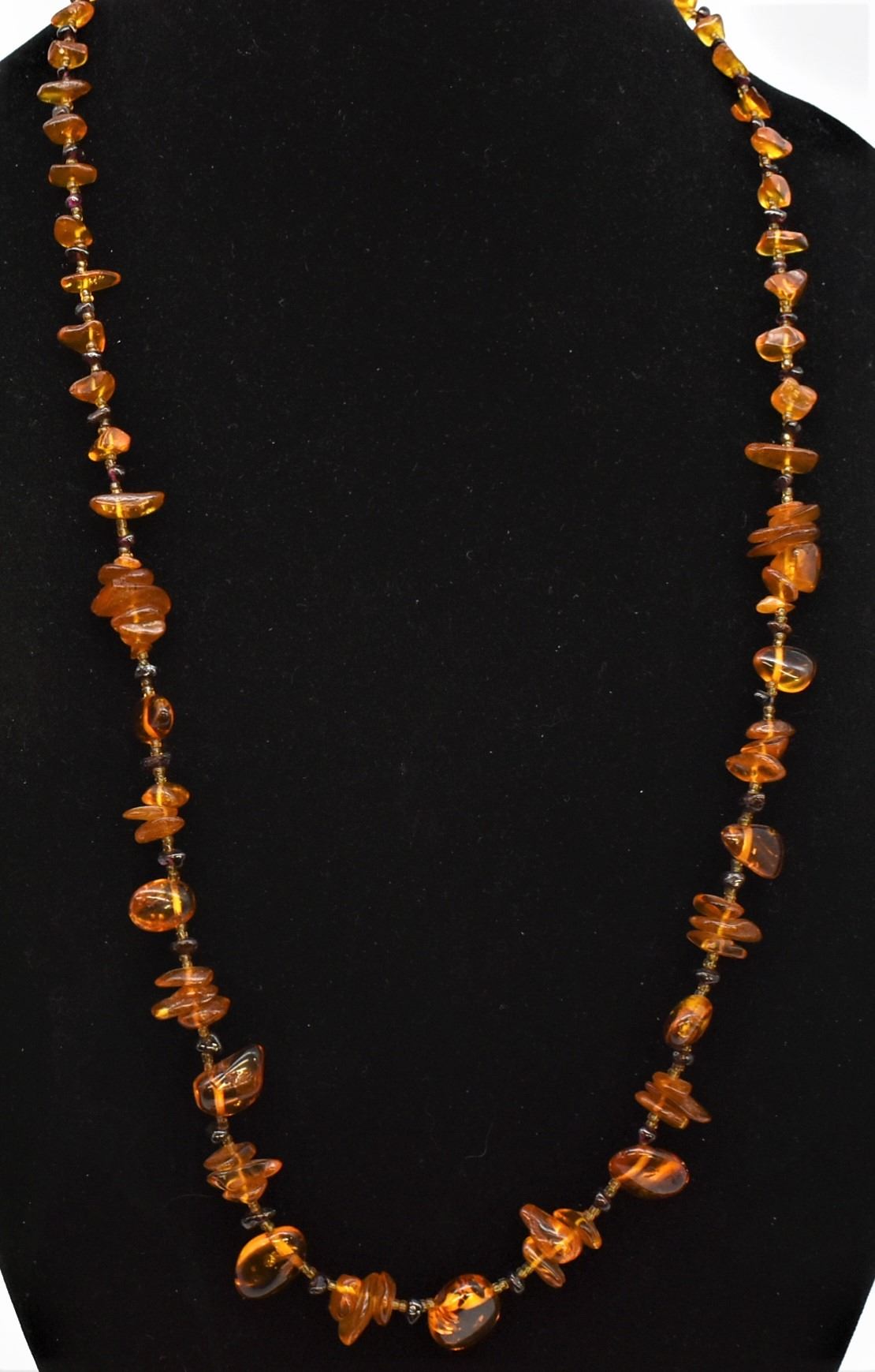 Estate Baltic Amber and Garnet Nugget Necklace, measures 32''L end to end, largest amber nugget measures .75''