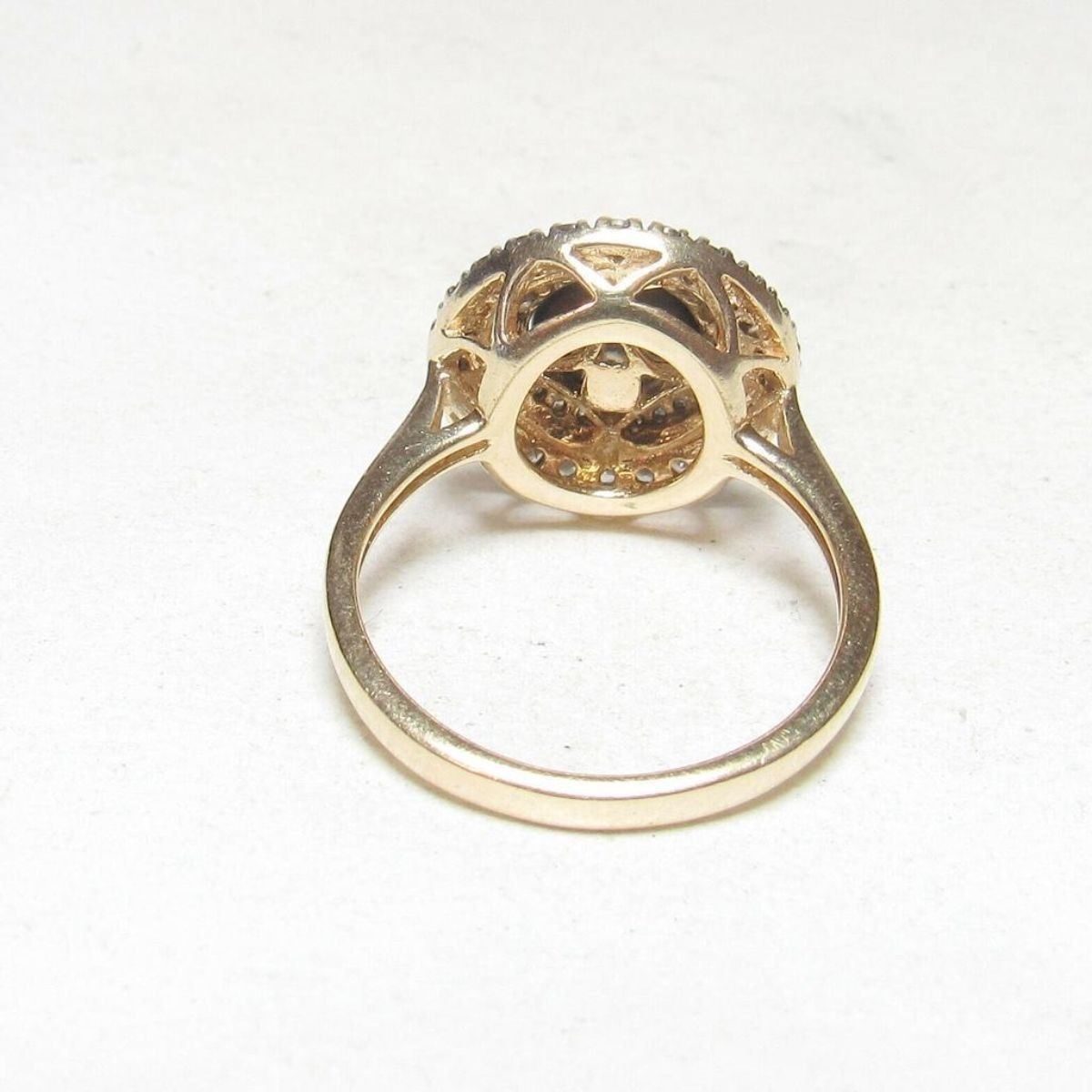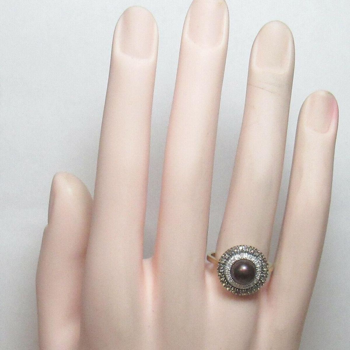 Beautiful estate piece - 14K Yellow Gold 7.0 mm Black Tahitian Pearl, Smoky Quartz & Diamond Ring. Stamped 14K on inside, weighing 4.9 grams, holding 7mm Tahitian Pearl with light blemishes, surrounded by 24 round natural smoky quartz gemstones ( approx total weight of .70cts ) & further surrounded by 24 single cut diamonds ( I1 clarity, I color, total weight .20cts ). Size 7.25.