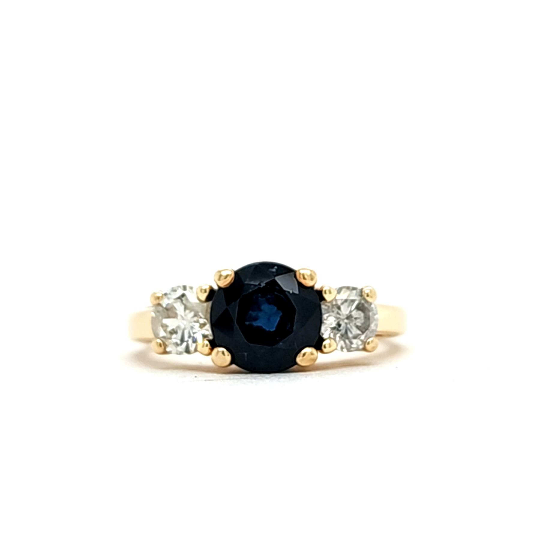 Genuine Sapphire and Earth-Mined Diamond Ring.& nbsp; This 14 karat yellow gold ring is a very nice estate find.& nbsp; The1.86 carat round, faceted dark blue sapphire is prong-set between approximately .60 carat (total weight of 2) round, brilliant-cut, G-H color, I1 clarity diamonds.& nbsp; The ring is US size 6.25 and has an approximate 2.2 mm shank.& nbsp; This ring can be resized for an additional $100, please allow an additional 10 days for shipping if we resize it.& nbsp; This is a preowned, estate item in very good condition. The ring is in excellent condition with little to no wear to the prongs or shank.& nbsp; The sapphire has abrasions on the facet lines and girdle that do not impair the visual beauty.& nbsp; This ring is certified and appraised for $17,600.00& nbsp; in new condition, estimated retail replacement value.