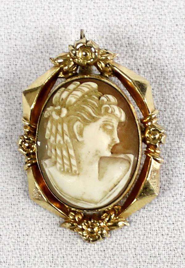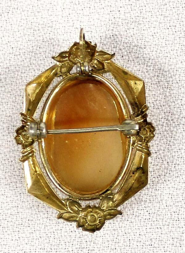 Estate Curtman Company Gold Filled Carved Shell Cameo Pin Pendant, measures 1.5''L x 1'', stamped 1/20 12K Gold Filled and hallmarked CC