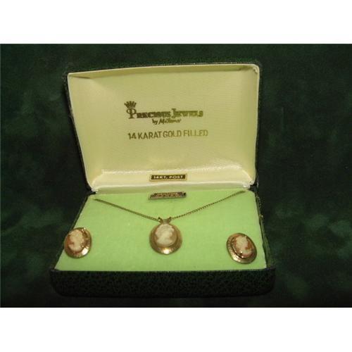 This lovely carved shell cameo necklace and earrings set is still in it's original box. The posts on the earrings are 14kt yellow gold and the rest of the set is 14kt gold filled. It weighs 5.7 grams.