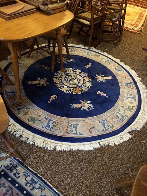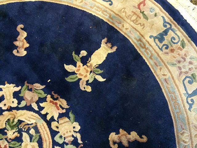 Estate Chinese Hand Woven Round Rug. Beautiful deep, rich blues and ivory with floral medallion. Measures 80" diameter. These items may be picked up in Torrington, CT. Appointment time will be scheduled after auction date.
