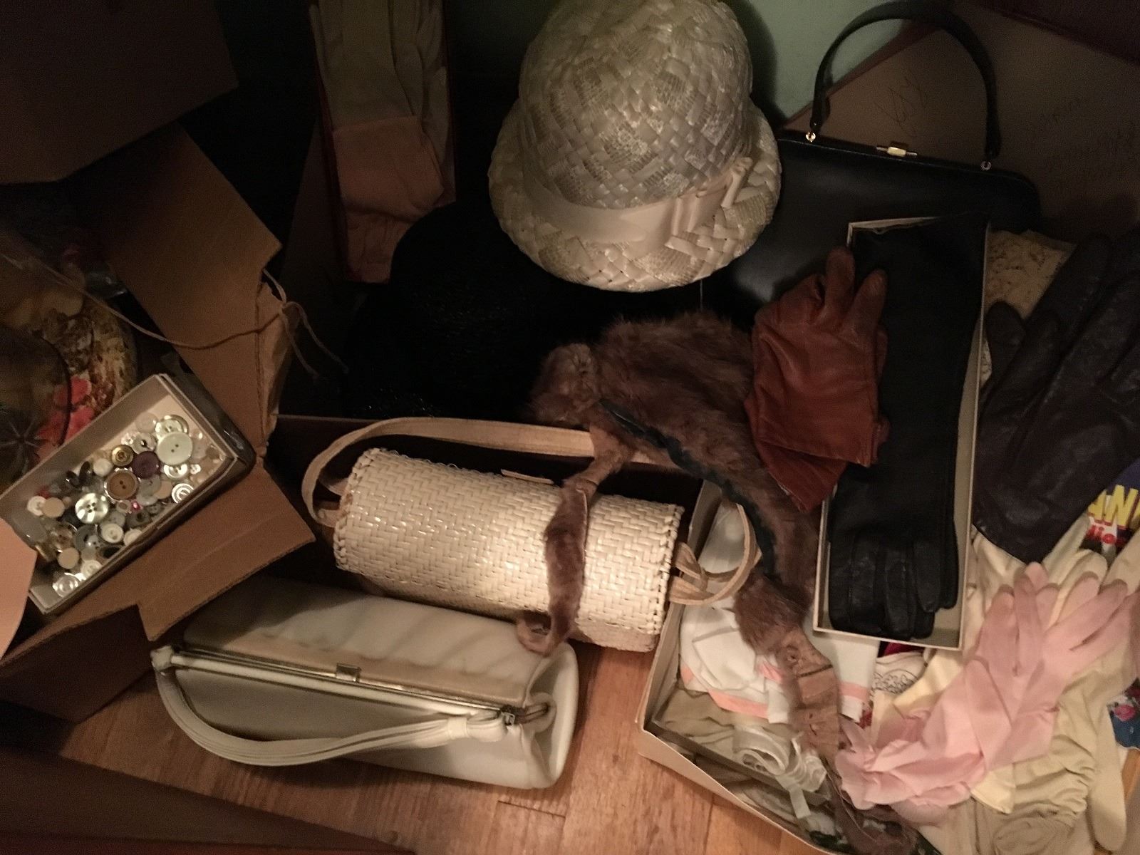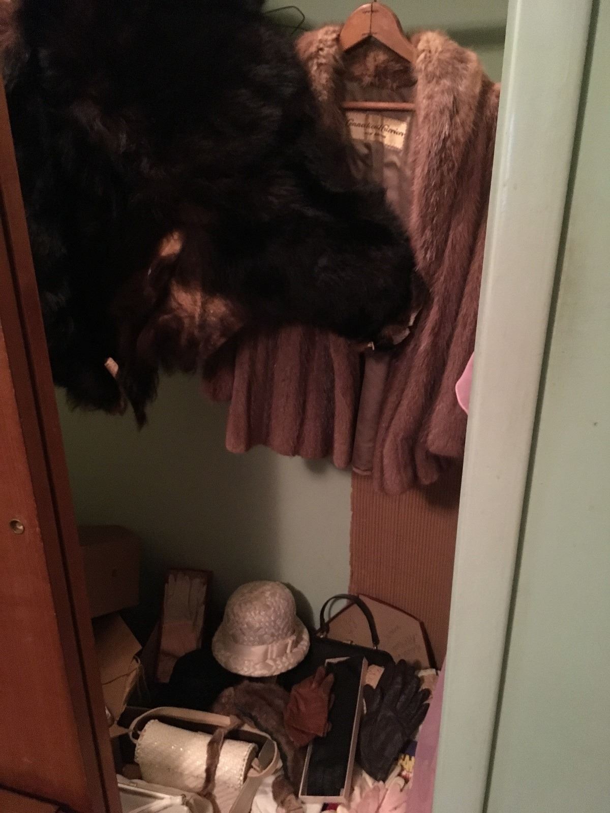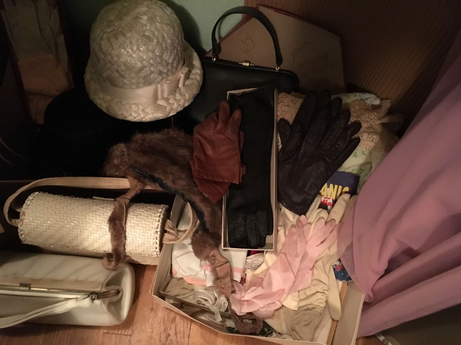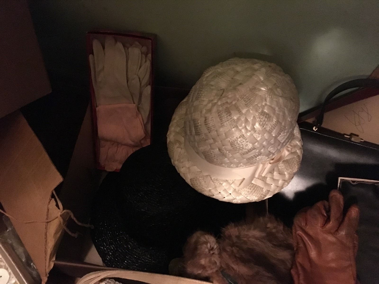 Estate lady's closet lot includes fur coat, long gown, white long gloves, white and pink lady's gloves, lady's leather gloves, hats, hankerchief's, doillies, sewing items, buttons, bear hide, being sold as found at the estate. (RL)