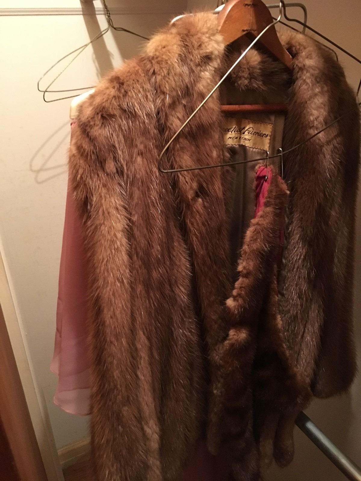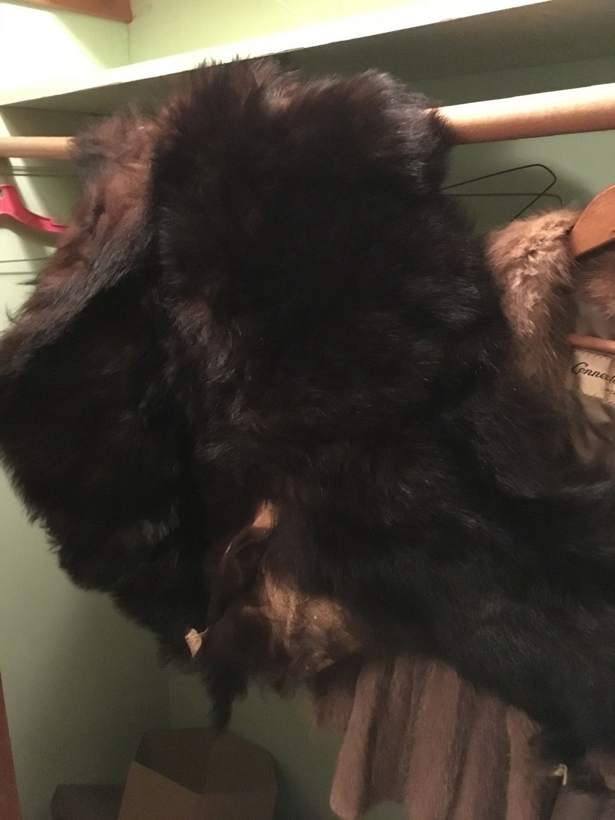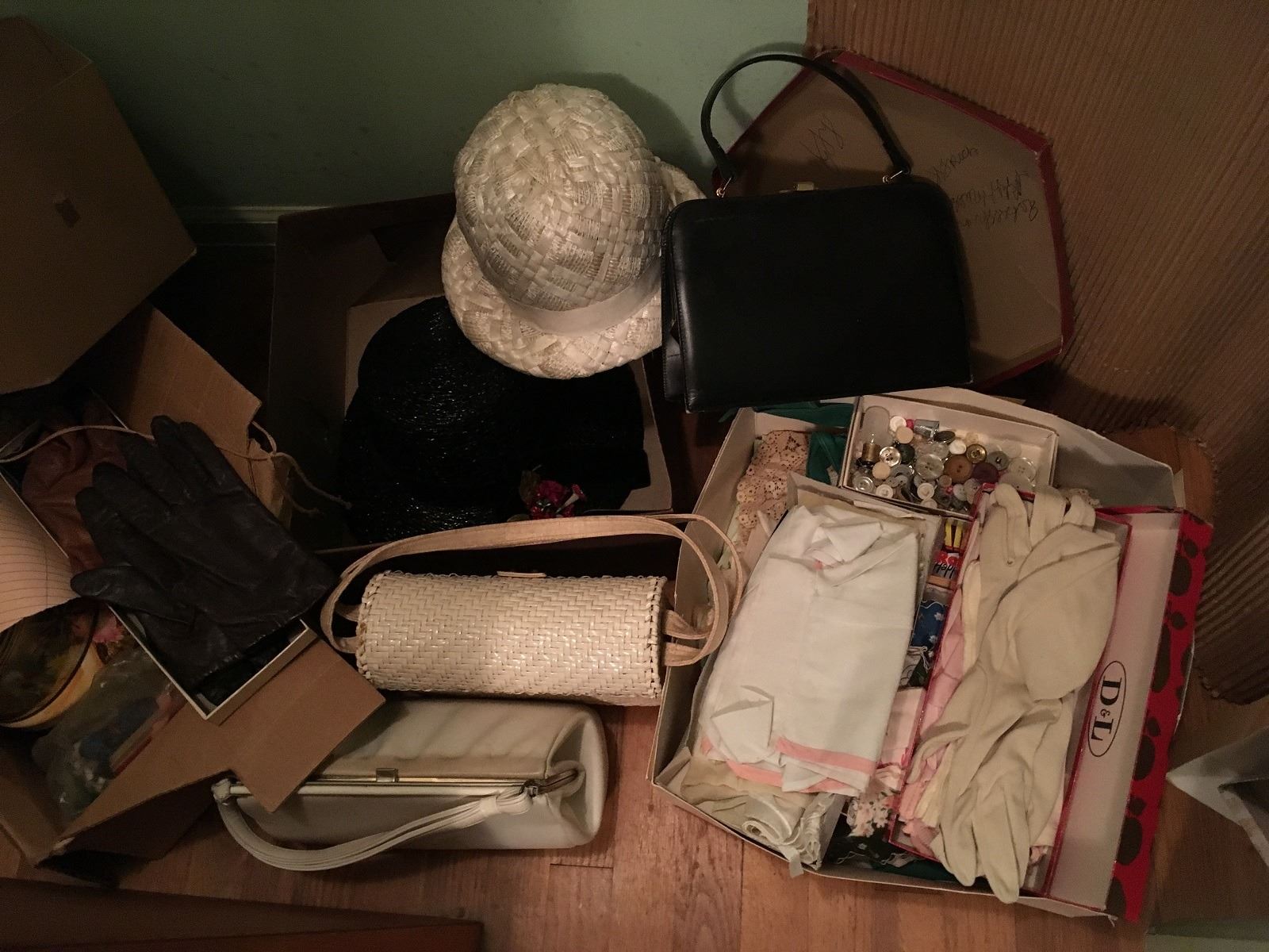 Estate lady's closet lot includes fur coat, long gown, white long gloves, white and pink lady's gloves, lady's leather gloves, hats, hankerchief's, doillies, sewing items, buttons, bear hide, being sold as found at the estate. (RL)