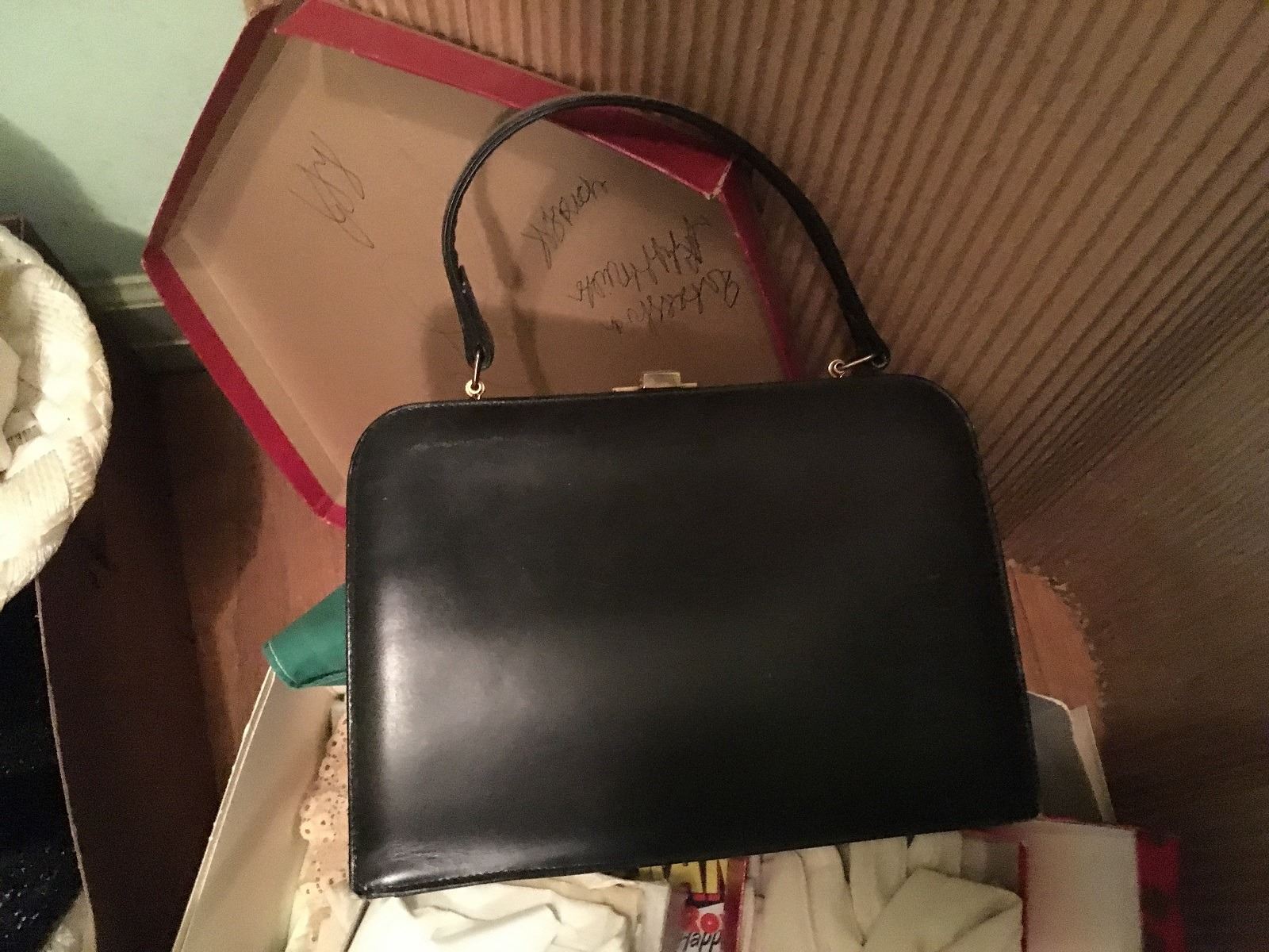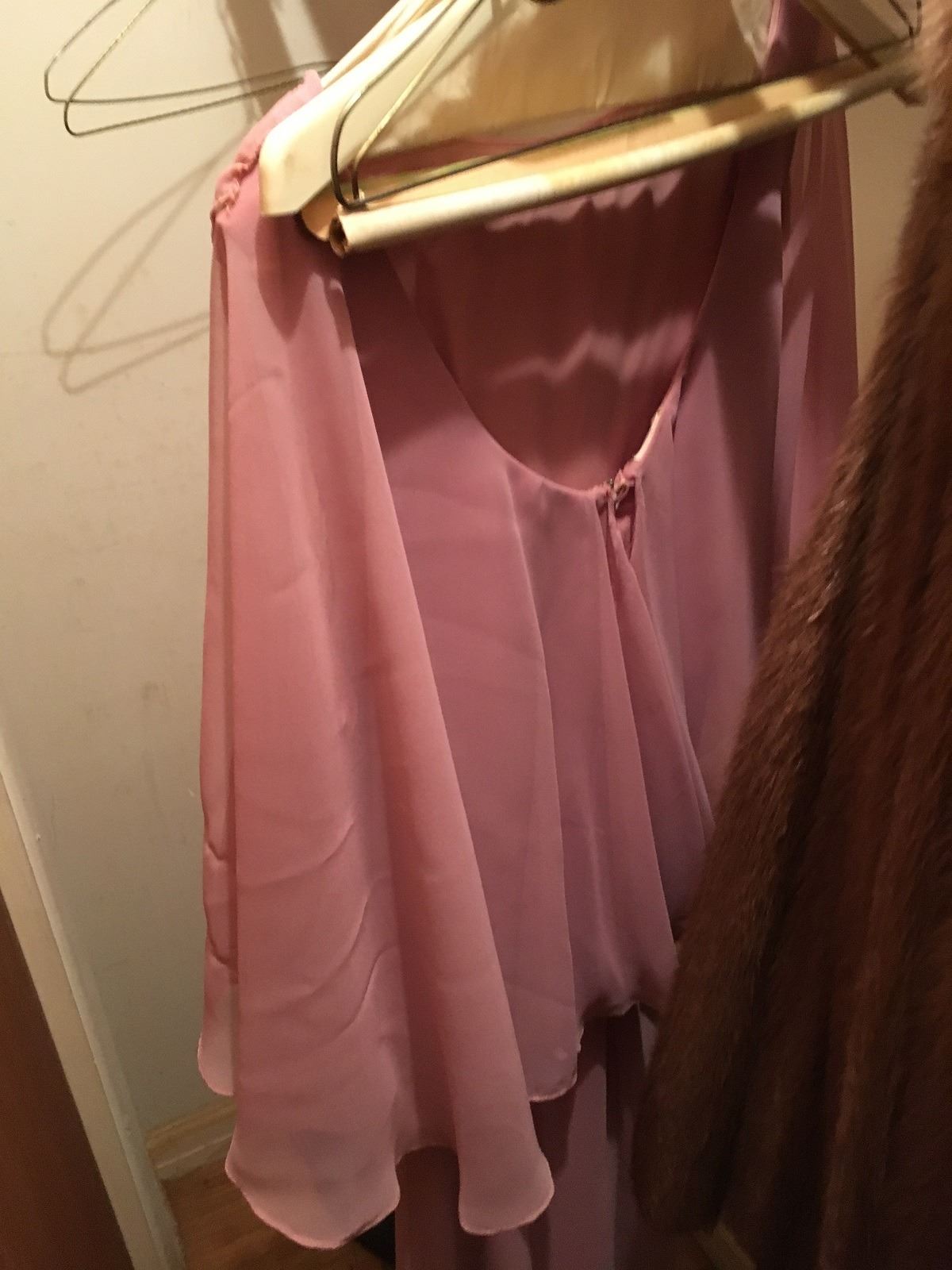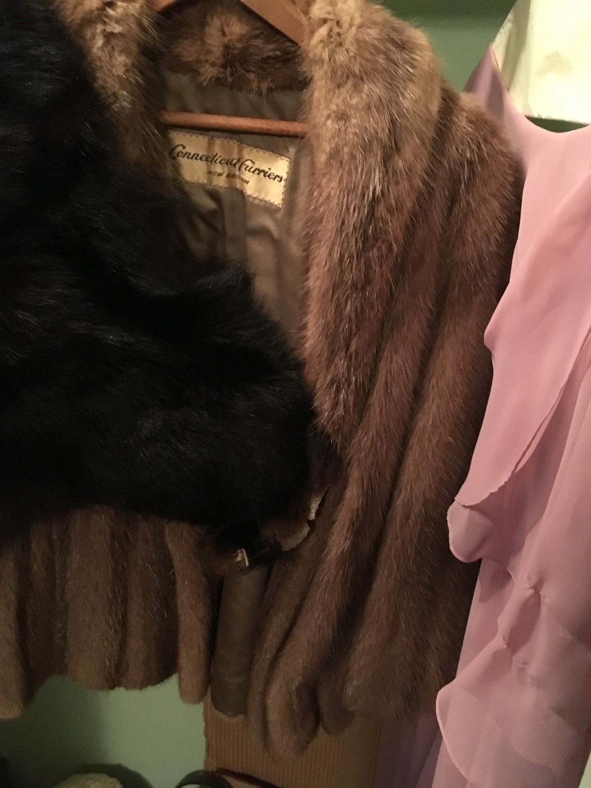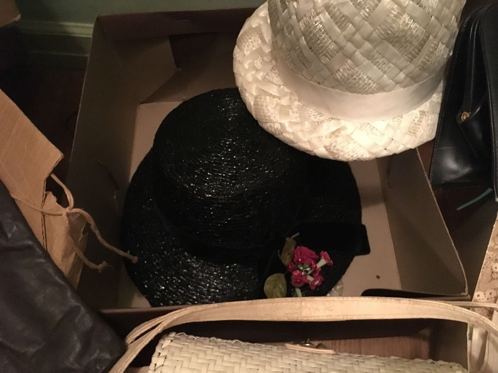 Estate lady's closet lot includes fur coat, long gown, white long gloves, white and pink lady's gloves, lady's leather gloves, hats, hankerchief's, doillies, sewing items, buttons, bear hide, being sold as found at the estate. (RL)