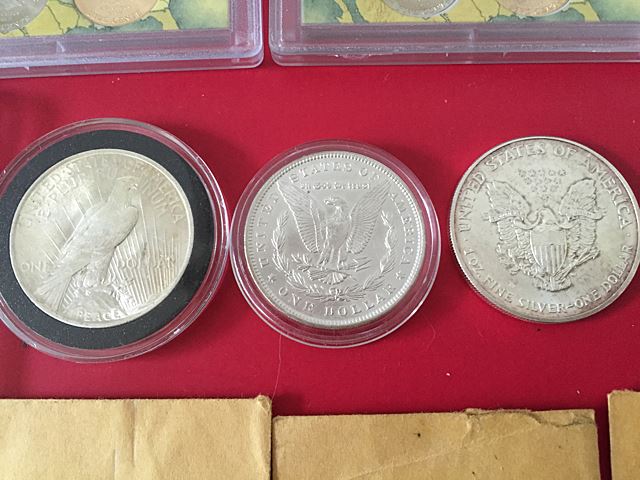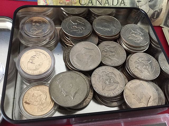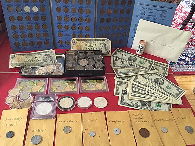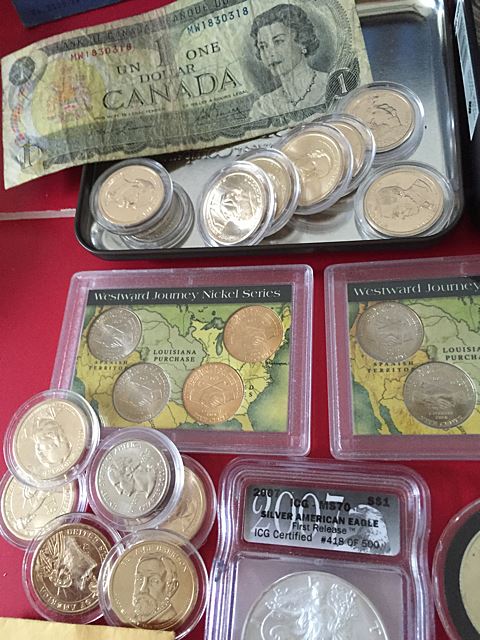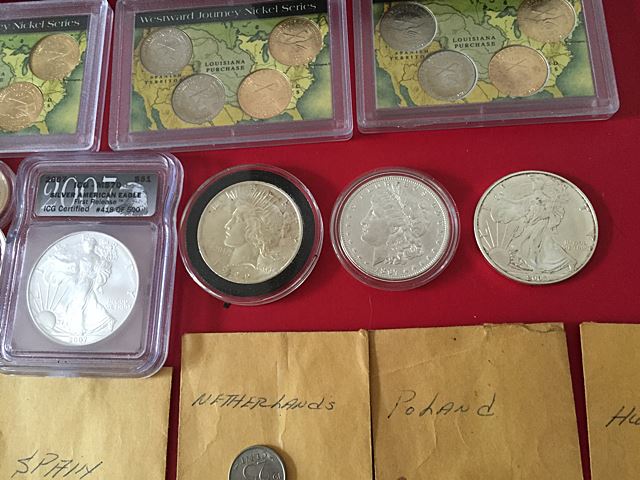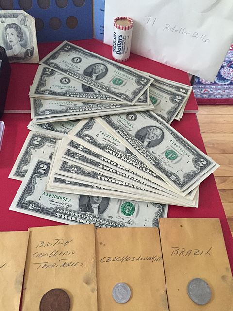Estate coin collection, including 71 $2 bills, over $55 face in modern Kennedy half dollars, and $25.00 Sacagawea dollar roll, plus 2 silver dollars, 2 1 oz. silver American eagles, 1 is graded, foreign coins, Lincoln head penny set.