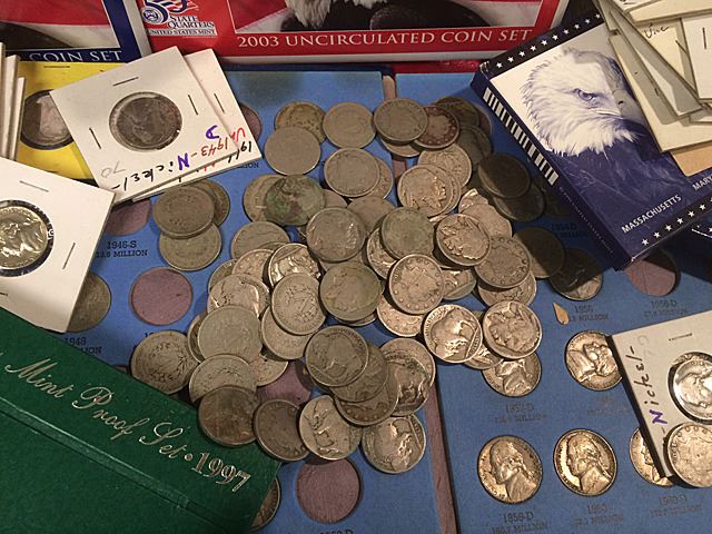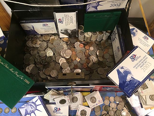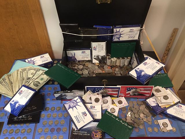 Contents of coin strong box include $282 Face in Half Dollars, $280 Face; $1 coins including Eisenhower and Susan B. Anthony, dollar bills (1963B series, and others), 2 $2 bills, $175 Face, dollars, gold Sacagawea dollars, half dollars, and mixed coins, 27 United States Mint Proof Sets, some are silver mint proof sets, Nickel Collection includes V, Buffalo, War Time silver, and lots of Jefferson nickels. 8 blue books, plus additional nickel collection with many silver nickels! (strong box not included).
