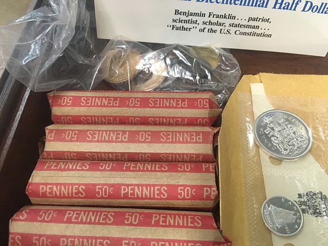 Estate coin lot includes Solid 14KT gold Ben Franklin Bicentenial coin, 1st day covers, $40 all in $2 bills, 12 Sacagawea dollars, Eisenhower Silver Dollar Centenial Proof, 1965 Canada Proof Set, rolls of pennies, and Basilea Domine Conserva Nos Is Pace, nice large commemorative coin, very ornate with griffin on back.