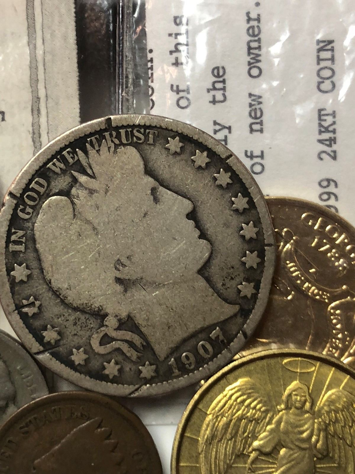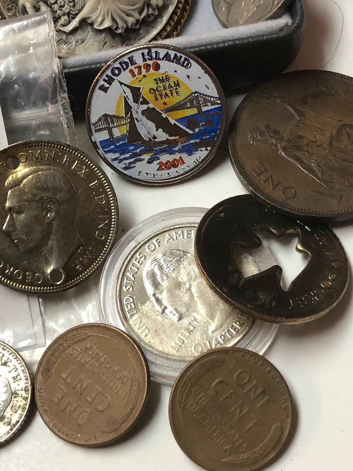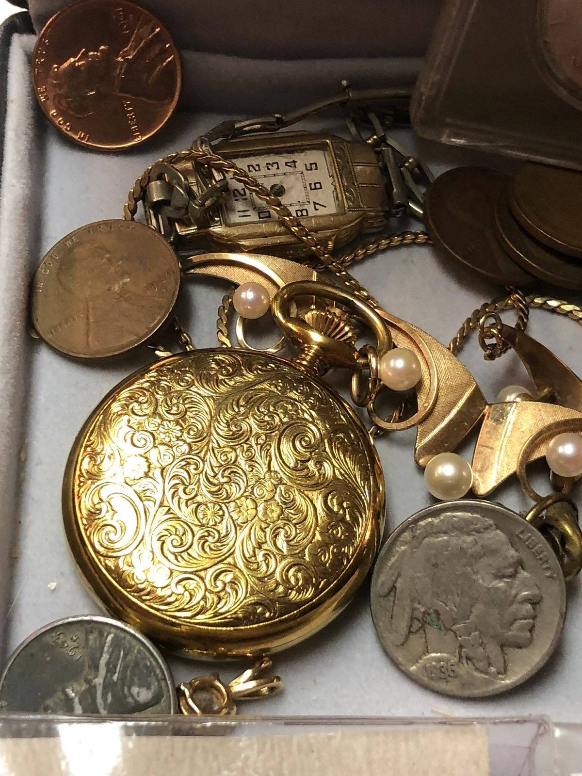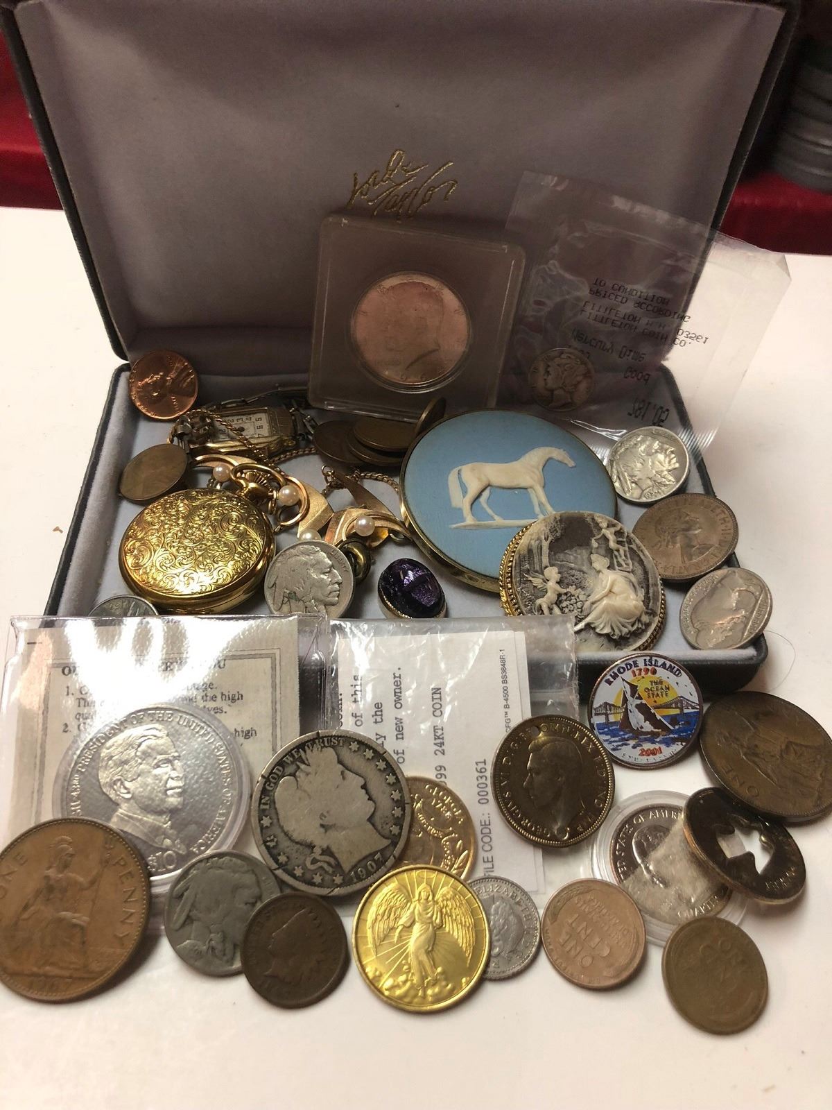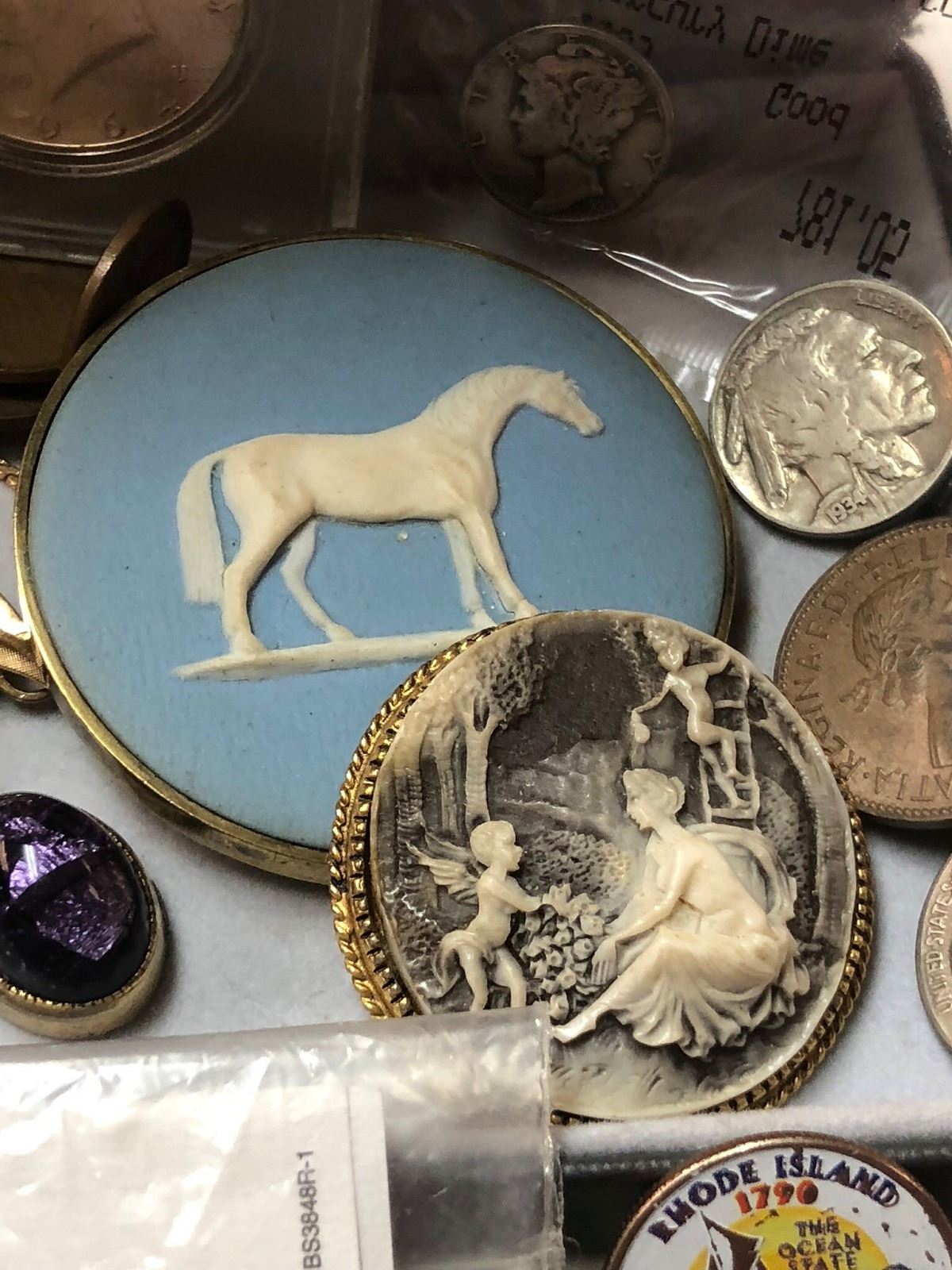 Estate coins, including silver, 2 cameos, one with horse, pocket watch, wrist watch, etc. Being sold as found at the estate.