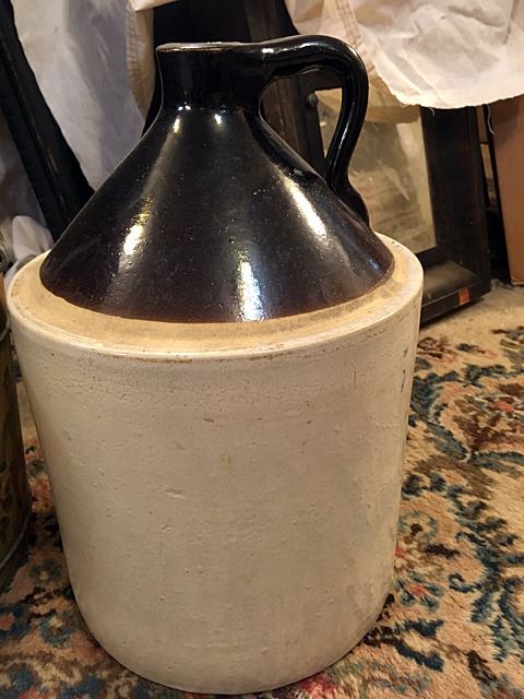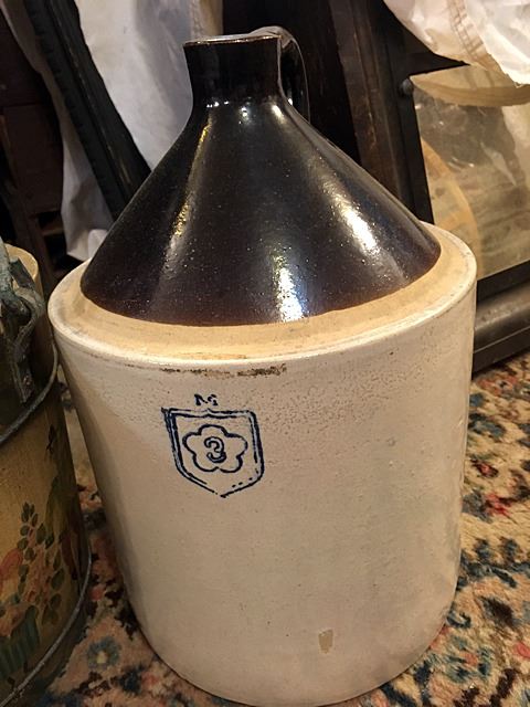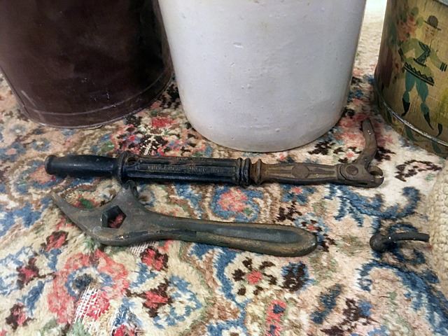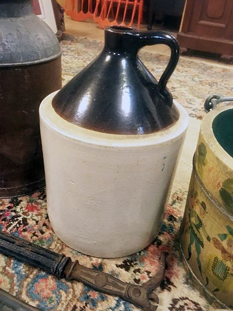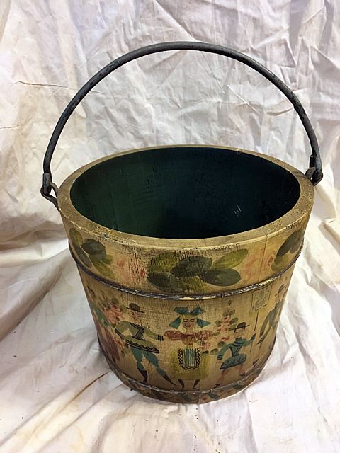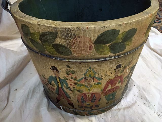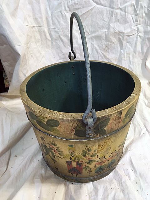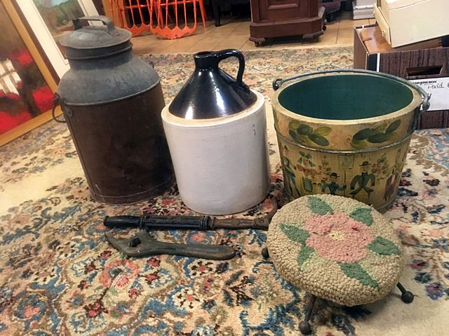 Estate Collectables lot includes a vintage ice cream can, stoneware jug, painted well bucket, vintage tools and needlepoint top stool. The well bucket is fully painted with dutch characters, the jug is stamped 3.