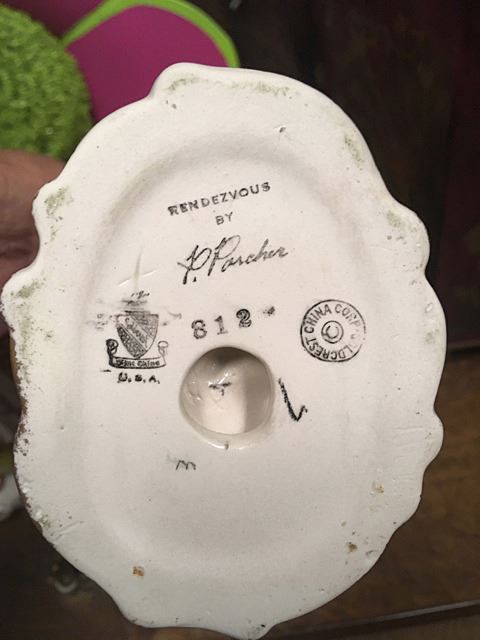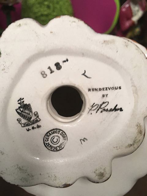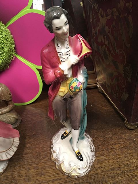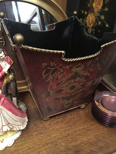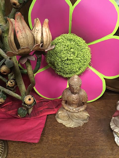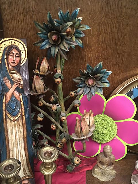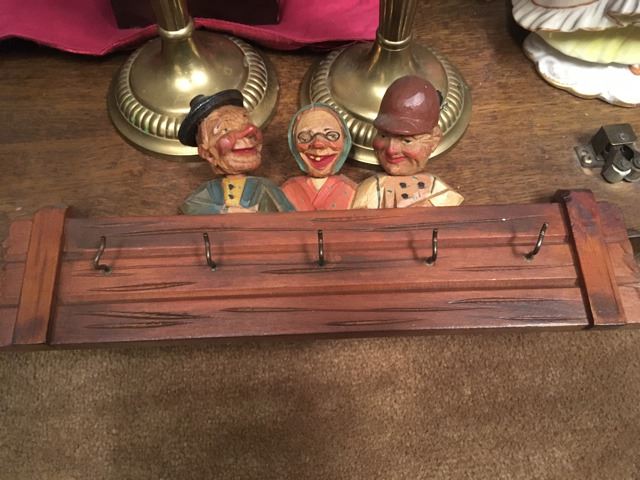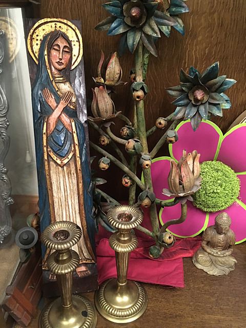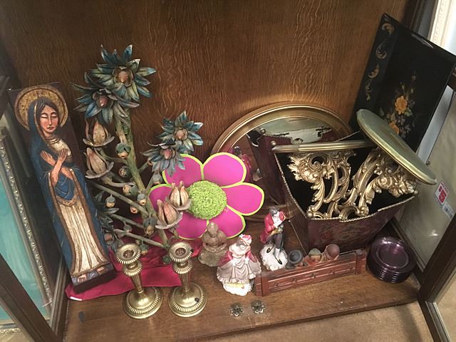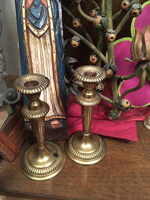 Estate Collectables lot includes 2 brass candle sticks, 2 decorative flower candle holders in worught iron, Virgin Mary plaque, vintage bobble head Black forest key holder, decorative shelves, purple glass coasters, 2 porcelain figurines, Victorian man and lady, Buddha statue, toleware tray, painted bin, and decorative large flower.