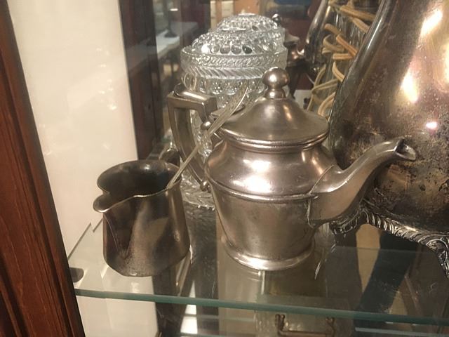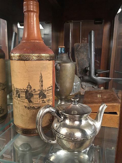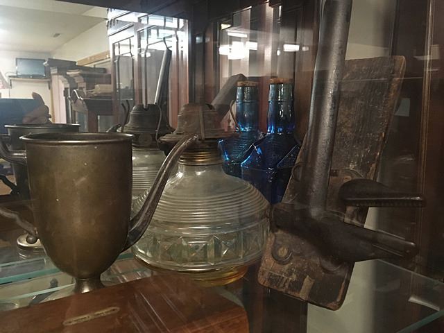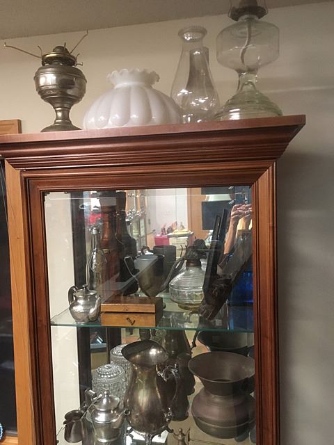 Estate collectables includes oil lamps, restaurantware creamers, water pitcher, brewery bottle, copper pot, weights, blue glass bottle, candle snuffer, etc.