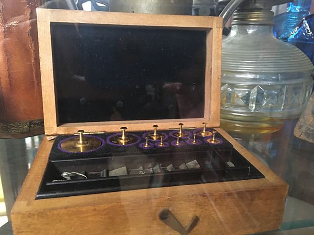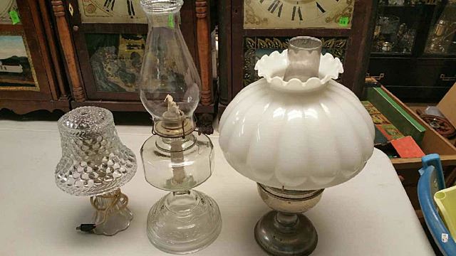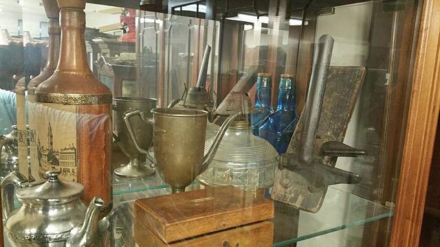 Estate collectables includes oil lamps, restaurantware creamers, water pitcher, brewery bottle, copper pot, weights, blue glass bottle, candle snuffer, etc.
